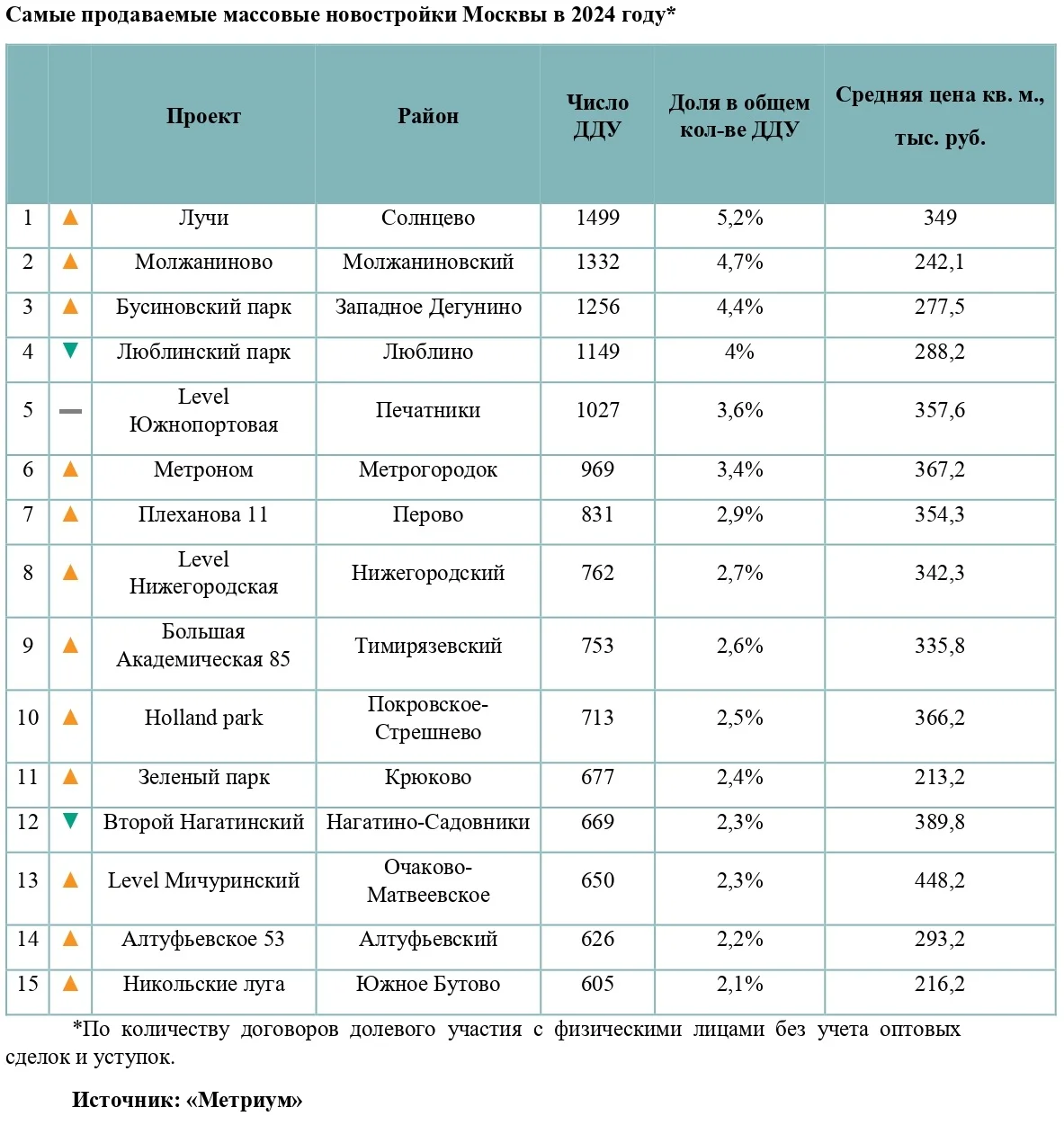 В 2024 году в массовом сегменте было совершено 28,6 тыс. сделок по ДДУ, что на 31% меньше, чем в 2023 году. Доля 15 наиболее востребованных проектов выросла на 1,9 п.п. Относительно 2023 года топ-15 самых продаваемых массовых новостроек «старой» Москвы обновился на семь позиций.