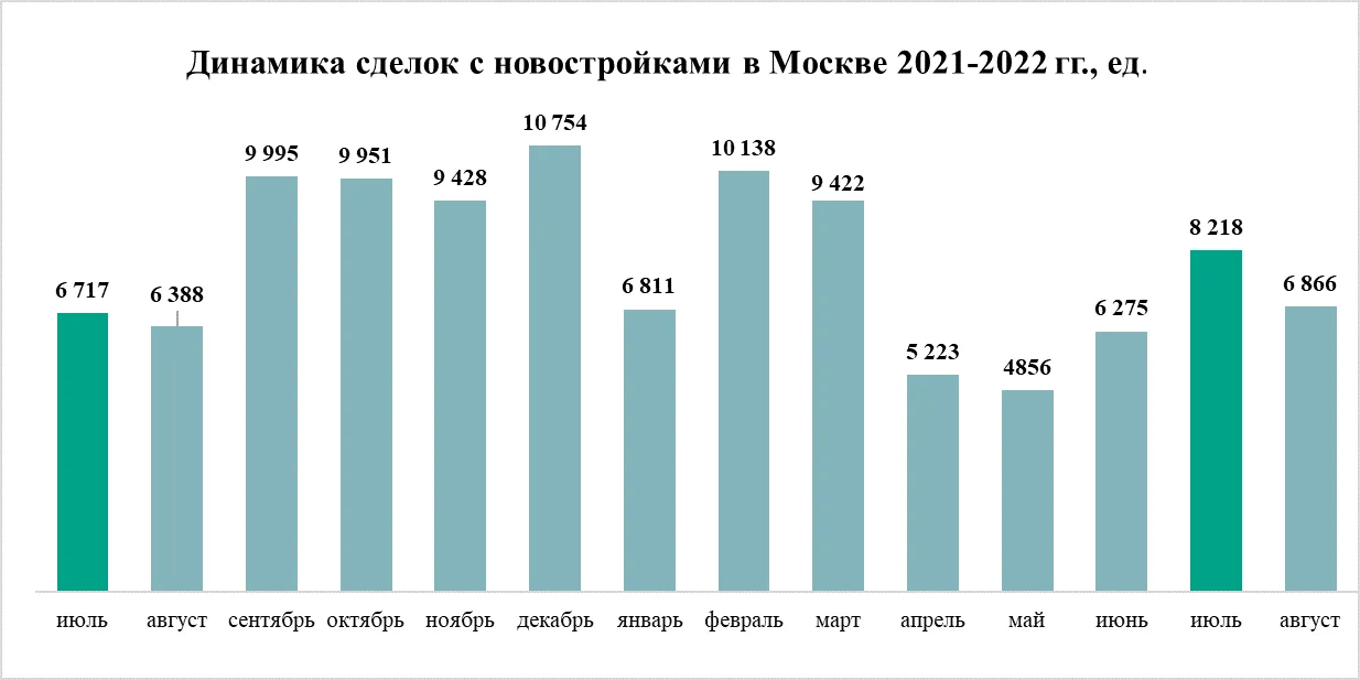 В августе участники долевого строительства, по данным Росреестра Москвы, заключили 6,9 тыс. ДДУ, что на 16% меньше, чем в июле. Таким образом, наметившееся еще в июне восстановление рынка новостроек замедлилось. Однако в целом августовский показатель спроса нельзя назвать кризисным, отмечают аналитики «Метриум». По сравнению с августом 2021 года число сделок выросло на 7%. Между тем в августе 2020 года на рынке зафиксировали 7 тыс. договоров участия в долевом строительстве, а в августе 2019 года – 5 тыс., то есть намного меньше, чем сейчас.