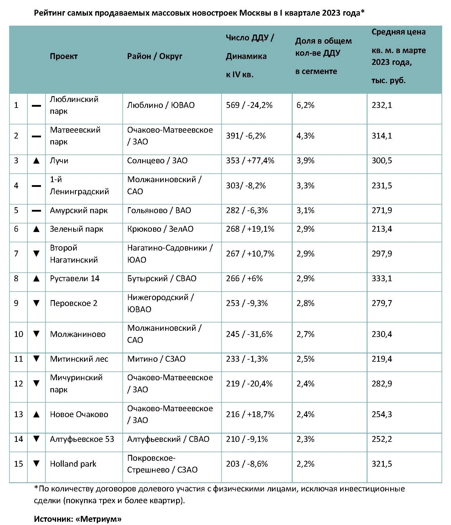 «Доля 15 самых востребованных новостроек массового сегмента по итогам I квартала 2023 года составила 46,8%. По сравнению с аналогичным периодом прошлого года она сократилась на 0,2 п.п., а относительно IV квартала 2022 года – на 0,7 п.п.», - указали в «Метриум», отметив, что 12 проектов из топ-15 реализуются одним девелопером – «ПИК».