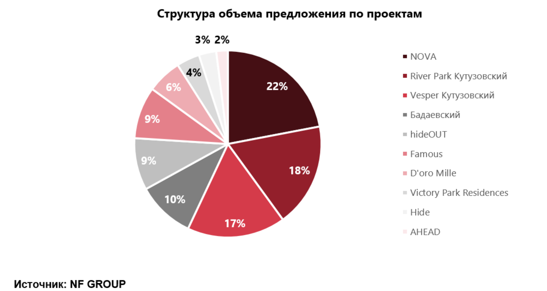 В структуре предложения по формату недвижимости большая часть представлена квартирами – 92%, остальные 8% – апартаменты. В разрезе форматов отделки больше половины лотов предлагаются без отделки, еще 27% – с white box. Меньше всего вариантов с отделкой – 18%. Среди реализуемых в локации комплексов наибольшее количество лотов в экспозиции представлено: в классе бизнес – ЖК NOVA (220 лотов или 22%), в классе премиум – ЖК «River Park Кутузовский» (180 лотов или 18%).