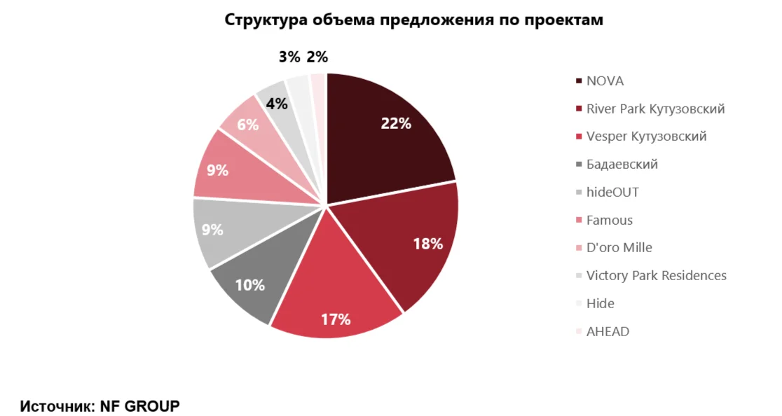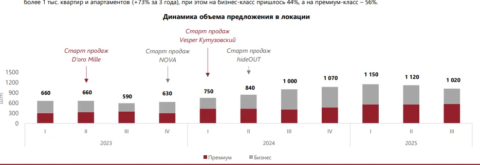 На первичном рынке жилой недвижимости в локации Кутузовского проспекта реализуется пять комплексов бизнес-класса: NOVA, Hide, hideOUT, Famous, AHEAD; и пять комплексов премиум-класса: «River Park Кутузовский», «Бадаевский», «Vesper Кутузовский», D’oro Mille и Victory Park Residences. С 2023 года объем предложения вырос практически в два раза, при этом на бизнес-класс пришлось 44%, а на премиум-класс – 56% экспозиции.