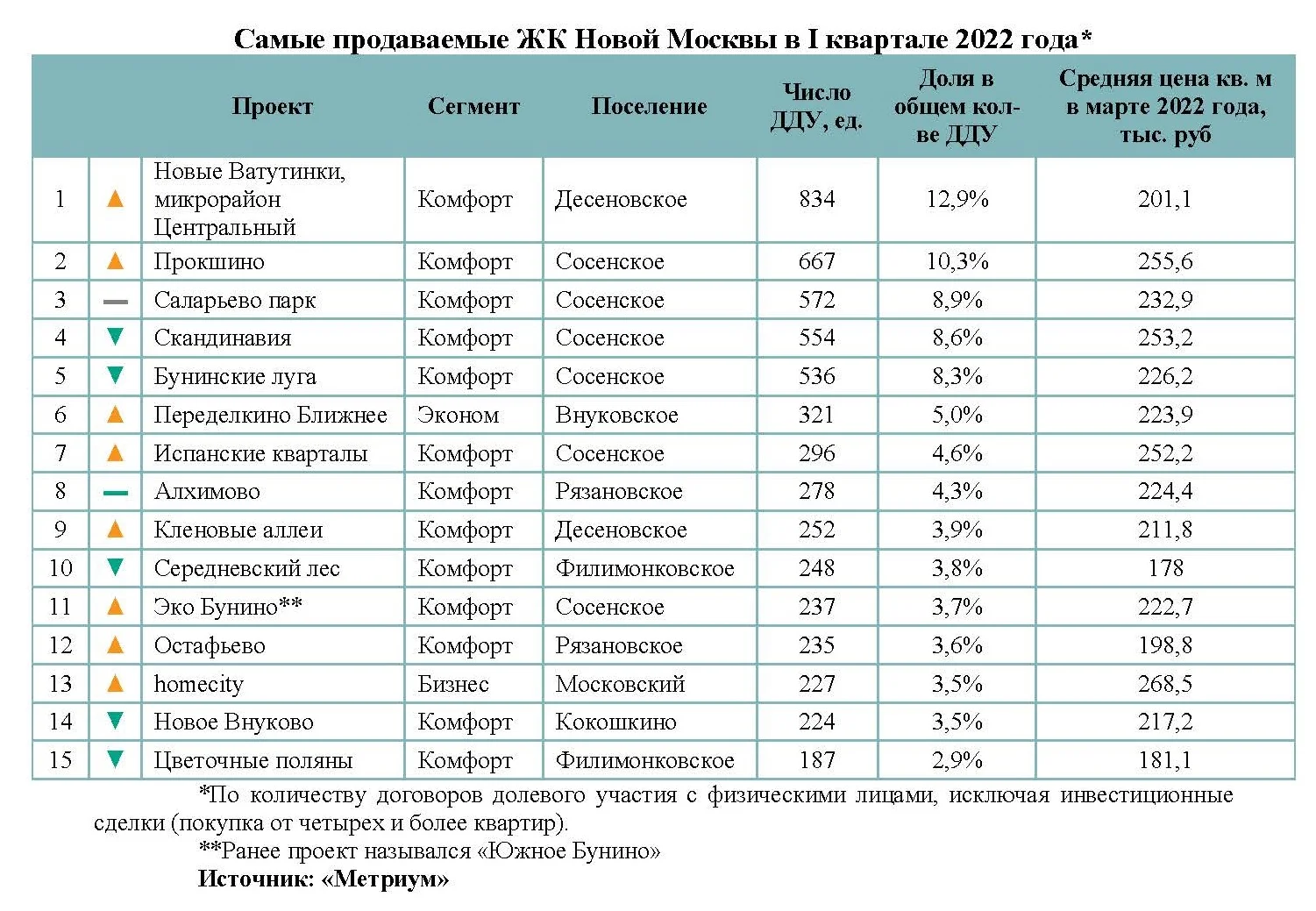 За квартал топ-15 самых продаваемых новостроек ТиНАО пополнили два проекта. Сама структура также претерпела изменения. На первое место вышел ЖК «Новые Ватутинки, микрорайон Центральный» от застройщика «Инвесттраст». За первые три месяца 2022 года в нем было заключено 834 договора долевого участия (или в среднем 278 ДДУ в месяц), что составляет 12,9% от общего количества сделок в ТиНАО. При этом по сравнению с показателями лидера рейтинга по итогам IV квартала 2021 года количество проданных квартир выросло на 36%. Самый успешный месяц – январь 2022 года, когда было реализовано 322 лота. Средневзвешенная стоимость квадратного метра по итогам марта 2022 года достигла 201,1 тыс. рублей.