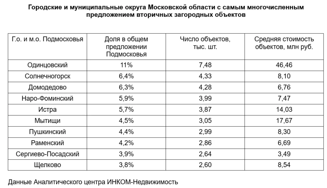 Аналитики ИНКОМ-Недвижимость изучили распределение предложения вторичной загородки в городских округах Подмосковья. В первую десятку территорий с самым большим выбором вошли городские округа Одинцовский (7,48 тыс. шт.), Солнечногорск (4,33 тыс. шт.), Домодедово (4,28 тыс. шт.), Наро-Фоминский (3,99 тыс. шт.), м.о. Истра (3,87 тыс. шт.), г.о. Мытищи (3,05 тыс. шт.), Пушкинский (2,99 тыс. шт.), м.о. Раменский (2,86 тыс. шт.), г.о. Сергиево-Посадский (2,64 тыс. шт.) и Щелково (2,60 тыс. шт.) – совокупно в них представлено 56% общей вторичной загородной экспозиции Московской области.