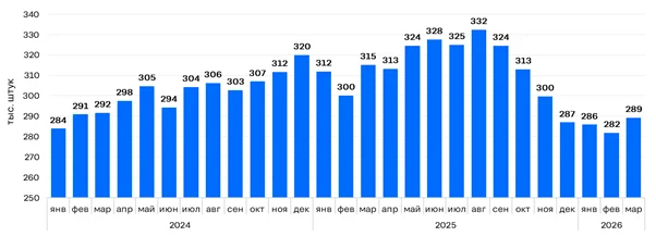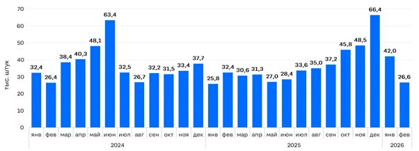 I квартал 2026 года оказался очень неравномерным по числу сделок. Январские продажи были неожиданно успешными – они выше любого месяца за последние 1,5 года, кроме IV квартала 2025 года. Показатели февраля – на уровне многолетних минимумов (даже после завершения льготной ипотеки летом 2024 года продавали больше).
