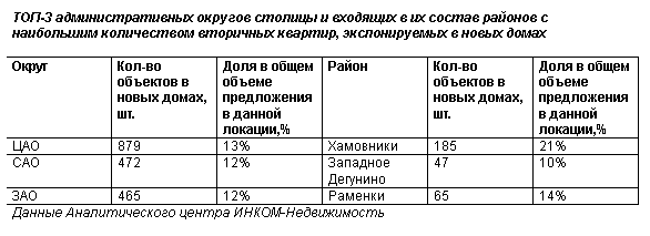 По информации компании, лидером по числу объектов, экспонируемых на вторичном рынке жилья в новых домах, является Центральный округ (ЦАО) – здесь продается 879 таких лотов (13% от общего объема предложения в округе).