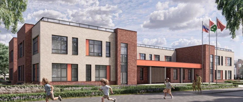 На прилегающей территории предусмотрены игровые площадки для детей разных возрастных групп, а также физкультурные площадки для подвижных игр. Пространство будет адаптировано под разные сценарии активности и безопасное пребывание детей на свежем воздухе.