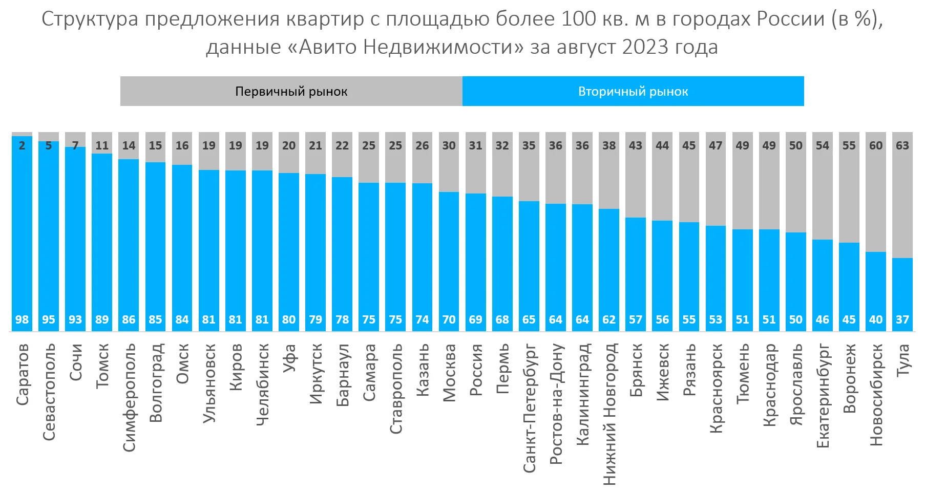 В среднем по России 69% предложений квартир площадью более 100 кв. метров в июле 2023 года приходилось на вторичный рынок и лишь 31% — на первичный. Наибольшая доля крупных вторичных квартир в Саратове (98%, доля новостроек — 2%), Севастополе (95%) и Сочи (93%) — вероятность найти большую квартиру в новостройке там была самой низкой. В четырех из 33 городов, участвовавших в исследовании, таких предложений было больше в новом фонде. В Туле на первичный рынок приходилось 63% квартир площадью от 100 кв. метров, в Новосибирске — 60%, в Воронеже — 55%, в Екатеринбурге — 54%.