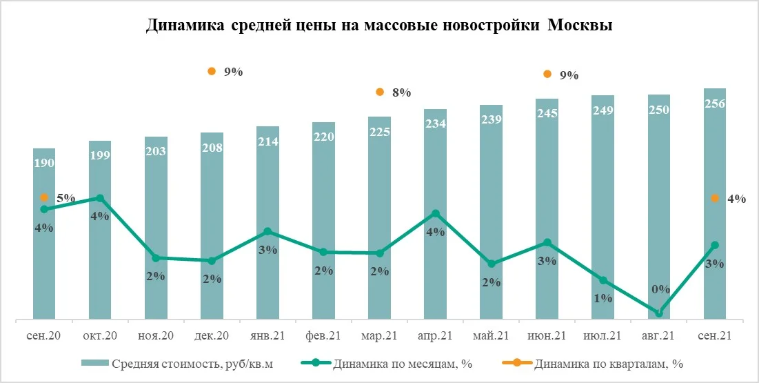 В сентябре 2021 года средняя цена квадратного метра на рынке массовых новостроек Москвы достигла 256 тыс. рублей, что на 4,5% больше, чем в июне, в последний месяц субсидирования ипотеки в Москве, подсчитали эксперты «Метриум». Замедление роста цен было отмечено только в июле и августе текущего года. При этом за третий квартал количество заключенных договоров долевого участия в Москве упало на 14,8% относительно прошлого квартала.