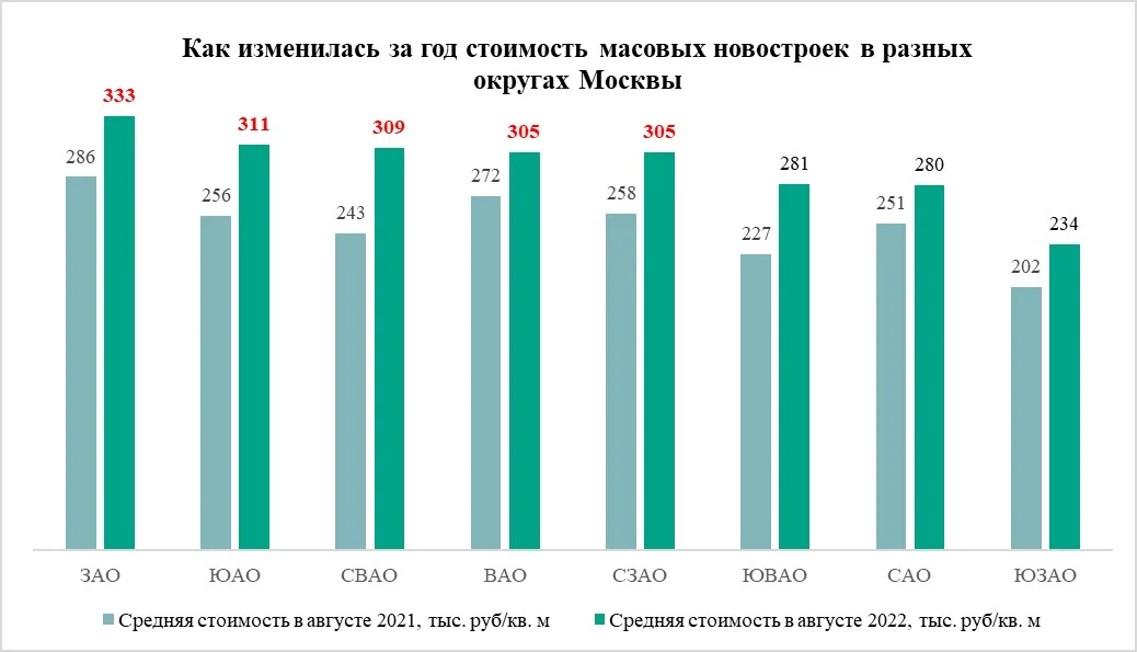 Самым дорогим округом на рынке массовых новостроек по-прежнему остается Западный АО, где средняя стоимость квадратного метра в августе достигла 333 тыс. рублей, что на 16% больше, чем 12 месяцев назад. Далее следует Южный АО – здесь квадратный метр в среднем обходился в августе 2022 года в 311 тыс. рублей. Это на 22% больше, чем в августе 2021 года, когда местные новостройки стоили в среднем 256 тыс. рублей за кв. метр. Третий округ по уровню цен на массовые новостройки Москвы – Северо-Восточный АО, где квадратный метр продается в среднем по 309 тыс. рублей, что на 27% больше, чем в августе 2021 года. На четвертом месте по уровню цен – Восточный АО, в котором девелоперы массовых новостроек предлагают свои проекты в среднем по 305 тыс. рублей за кв. м против 272 тыс. рублей в августе 2021 года. Цены выросли здесь за 12 месяцев на 12%. Наконец пятый округ, где средний квадратный метр стал дороже 300 тыс. рублей – Северо-Западный АО. Новостройки эконом- и комфорт-класса здесь продаются в среднем за 305 тыс. рублей, что на 18% больше, чем год назад, когда они стоили в среднем 258 тыс. рублей.