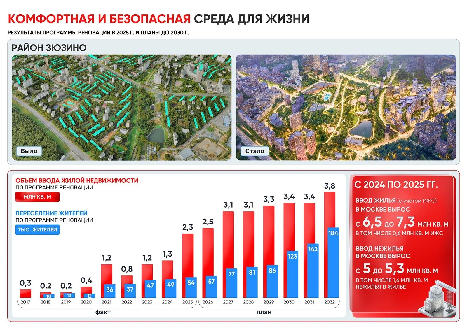 По словам Сергея Собянина, программа реновации, в рамках которой в 2025 года было введено 2,3 млн кв. метров недвижимости, является драйвером роста жилищного строительства в столице.