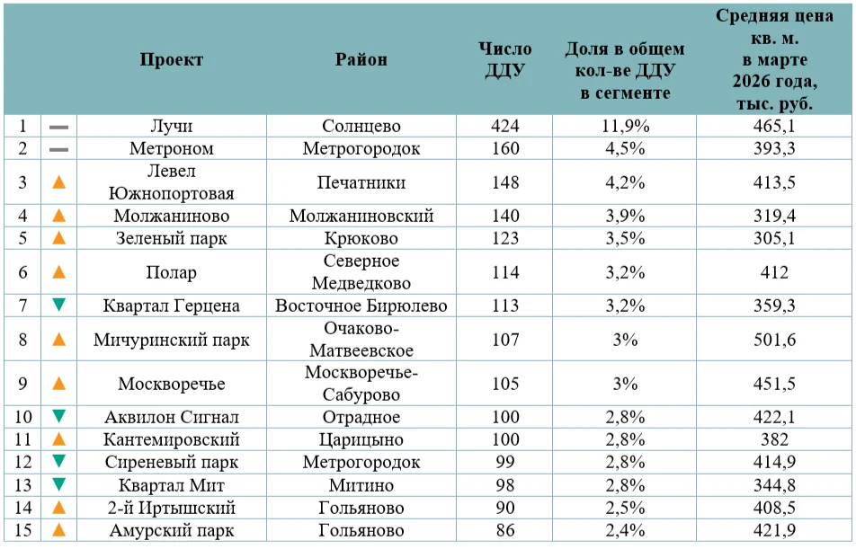 Первое место в списке самых продаваемых массовых новостроек второй квартал подряд занимает ЖК «Лучи» от Группы ЛСР. В январе-марте 2026 года в нем заключено 424 договора долевого участия (в среднем 141 сделка в месяц), что составляет 11,9% от числа ДДУ в массовом сегменте. Средняя цена кв. метра в проекте в марте 2026 года достигла 465,1 тыс. рублей.