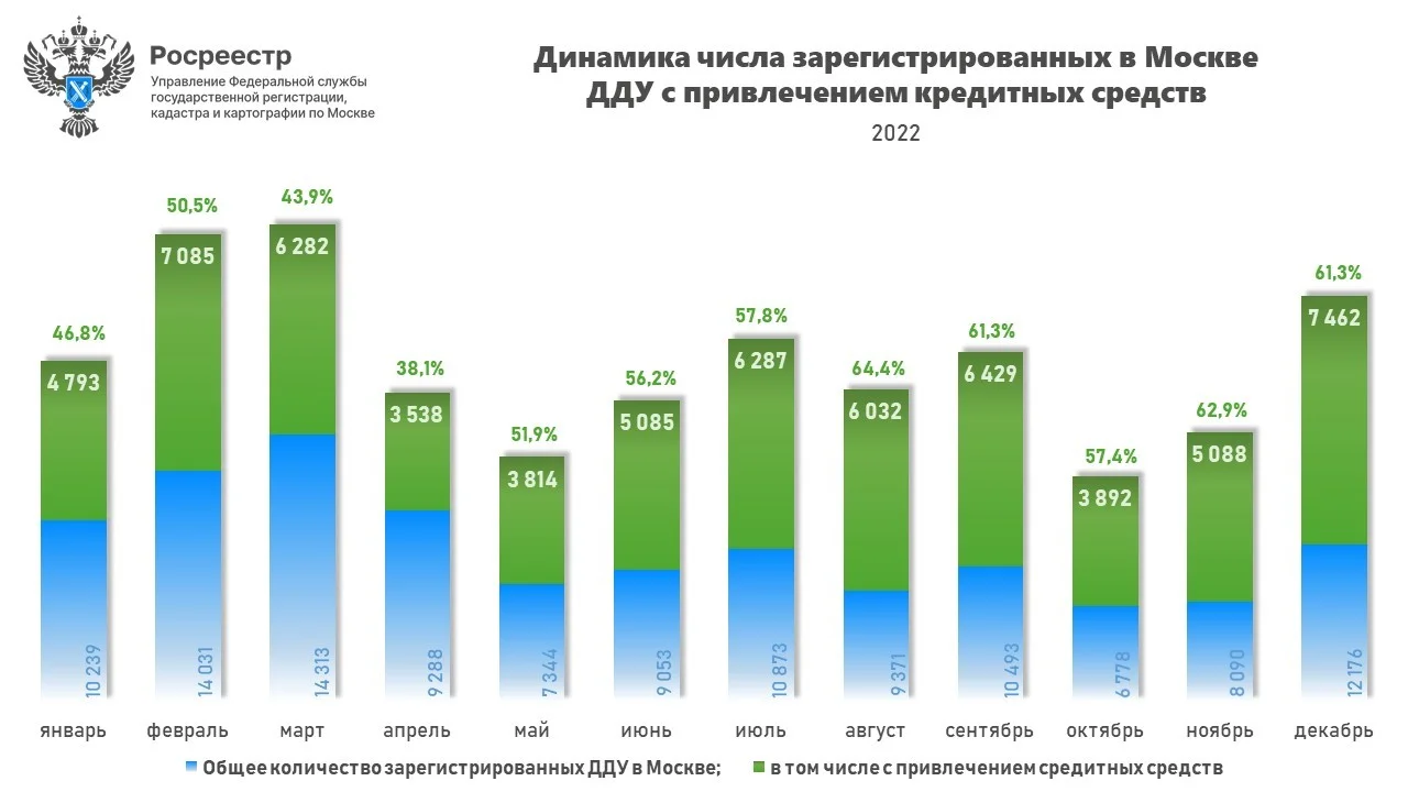 «Всего в 2022 году московским Росреестром зарегистрировано 65 787 долевых договоров с привлечением кредитных средств. По итогам года количество регистраций ипотечных сделок на первичном рынке Москвы уступило 2021 году 4,4% или чуть более 3 тысяч ДДУ. При этом доля кредитов от общего числа зарегистрированных сделок в столице составила почти 54%. В предыдущем году этот показатель был равен 47,8%», — отметил руководитель управления Росреестра по Москве Игорь Майданов.