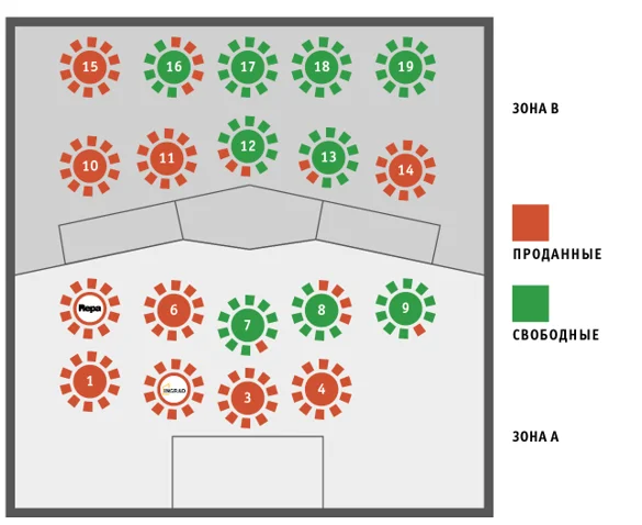 Взгляните, как много тех, кто уже знает где, с кем и как проведет вечер 10 октября, на нашей схеме показаны доступные места за столиками.