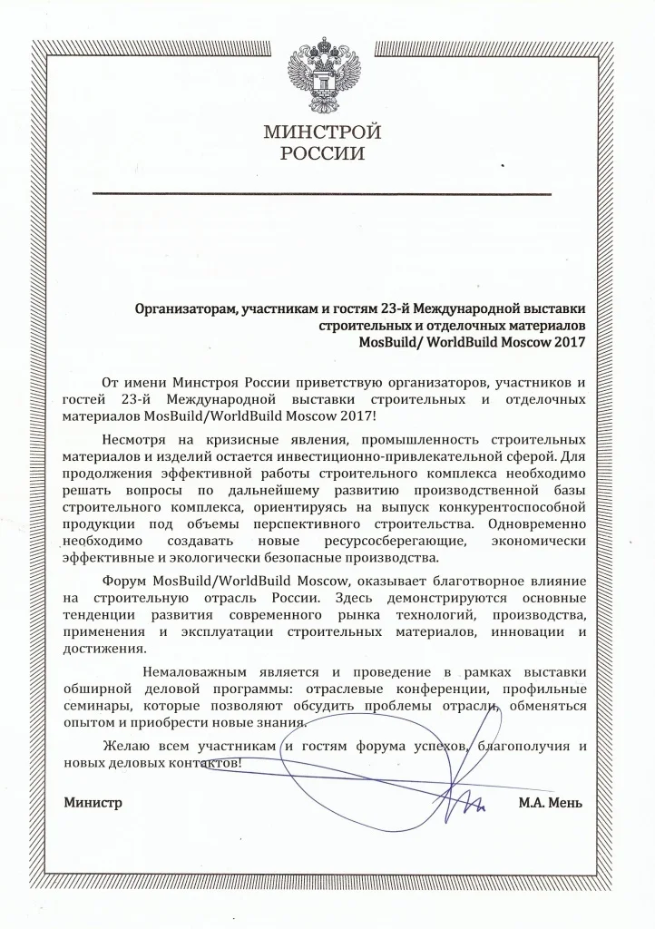 Министр строительства и ЖКХ Михаил Мень отметил высокий авторитет и благотворное влияние выставки MosBuild/WorldBuild Moscow на строительную отрасль России. В своем приветственном письме Михаил Александрович подчеркнул важность демонстрации основных тенденций, инноваций и достижений современного рынка.