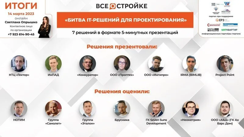 В новом выпуске уникального формата было представлено 7 инновационных IT-решений для проектирования в строительстве. Девелоперы особо отметили продукты компаний «Конкуратор», BIMLIB и PropTech, а Группа «Самолет» анонсировала выход собственных разработок на рынок.