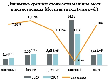 В массовом сегменте продается 3528 лотов (+68,5% за год), в бизнес-классе – 7713 лотов (-6,3%), в премиум-классе – 1295 лотов (-25,2%), в элитном сегменте (без учета закрытых продаж) – 517 лотов (+122,4%). Средняя стоимость предложения машино-мест на первичном рынке «старой» Москвы по итогам 2024 года достигла 3,65 млн рублей (+ 6,1%).
