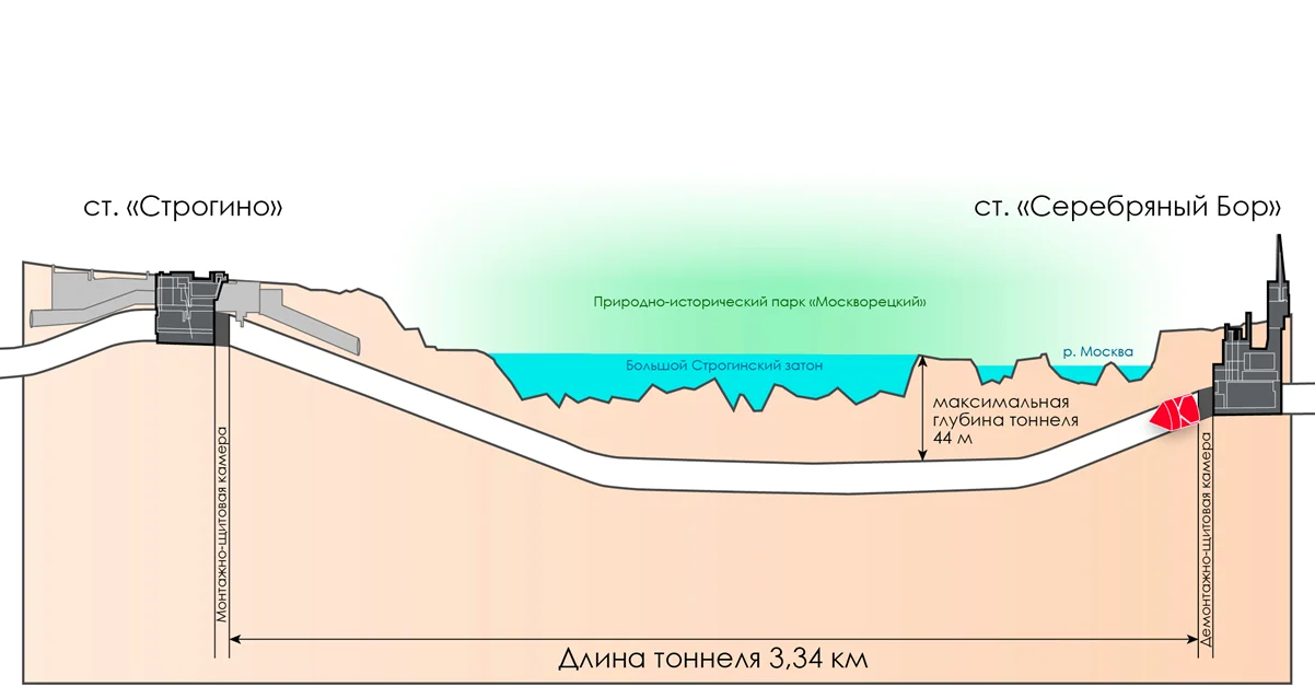 Сооружение метротоннеля между стациями "Серебряный Бор" и "Строгино" является сложной инженерной задачей. В будущем поезда будут идти под крупными водными объектами – Москвой-рекой и Большим Строгинским затоном. В зоне пересечения с линией метро ширина русла Москвы-реки составляет более 250 м, Большого Строгинского затона – порядка 1,5 км.