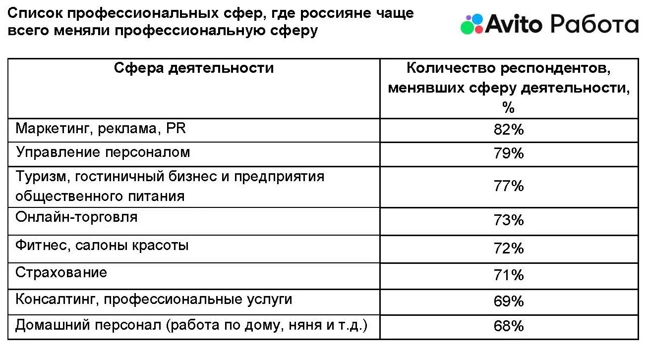 Чаще всего россияне, заявившие о смене сферы деятельности, работают в сфере маркетинга, PR и рекламы (82%), управления персоналом (79%), гостинично-ресторанного бизнеса (77%). Реже всего меняют профессиональную сферу медицинские работники и представители сферы образования. Ни разу не меняли профессиональную сферу 52% опрошенных работников сфер медицины и фармацевтики, 49% — образования и науки, 36% — юриспруденции.