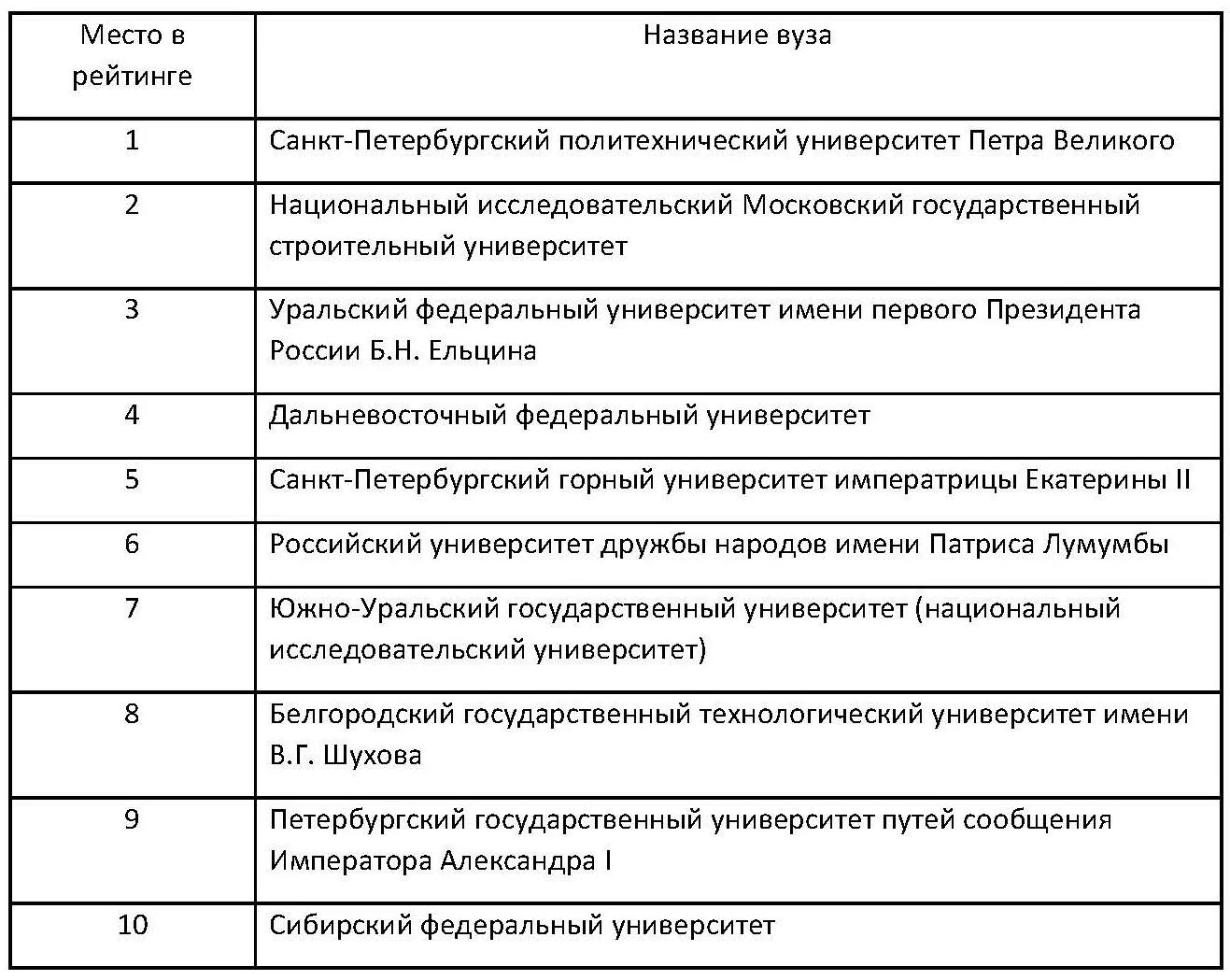 Первое место среди строительных вузов России занял Санкт-Петербургский политехнический университет Петра Великого, на втором месте - Национальный исследовательский Московский государственный строительный университет. В тройку лидеров вошел Уральский федеральный университет имени первого президента России Б.Н. Ельцина.