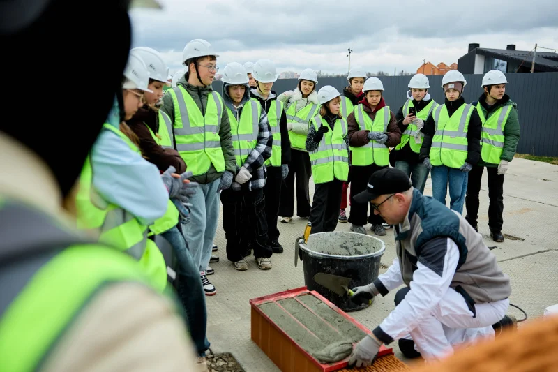 Практическая часть программы состоялась на строительной площадке проекта. Здесь для участников провели мастер-класс по работе с керамическими блоками Porotherm, которые используются при строительстве жилого комплекса. Школьникам показали технологию кладки, объяснили ключевые принципы работы с материалом, после чего они смогли самостоятельно выполнить демо-укладку из теплой керамики под контролем специалистов.
