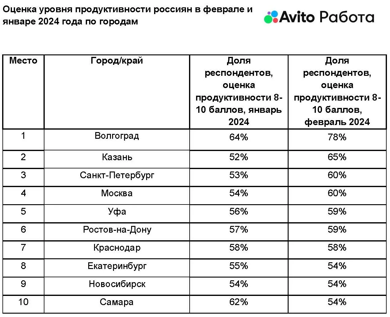 Самыми продуктивными работниками в России в феврале 2024 года оказались жители Волгограда (78%), Казани (65%), Санкт-Петербурга и Москвы (60% соответственно). Таковы результаты исследования, проведенного платформой «Авито Работа».