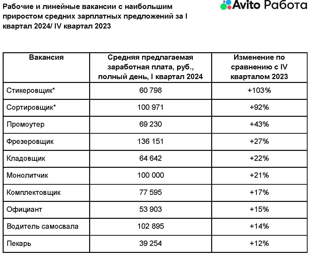 Наибольший прирост средних предлагаемых заработных плат отмечен у стикеровщиков, занимающихся проведением учета товаров посредством оклеивания его стикерами или сканирования штрих-кодов — в два раза, с 29 929 рублей до 60 798 рублей в месяц, а у сортировщиков средний предлагаемый месячный заработок также вырос почти вдвое — с 52 498 рублей до 100 971 рубля в месяц.