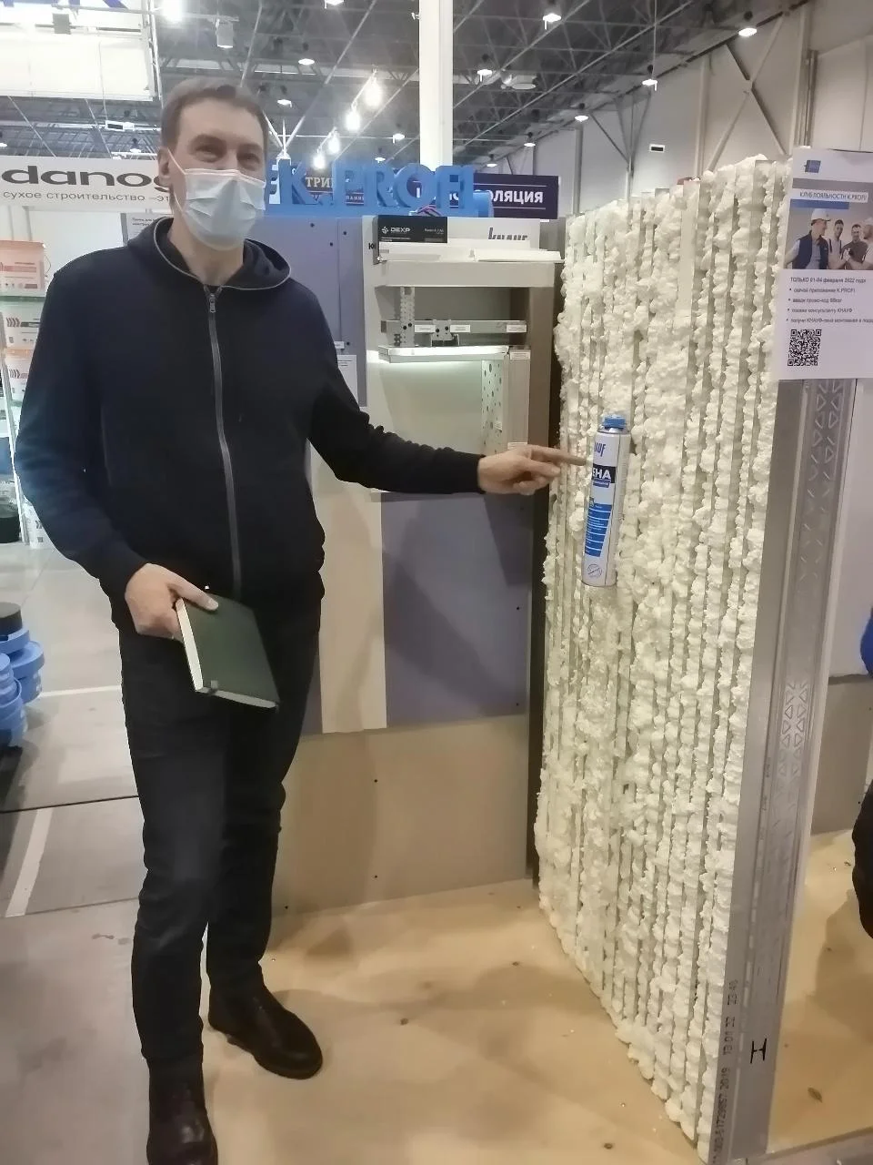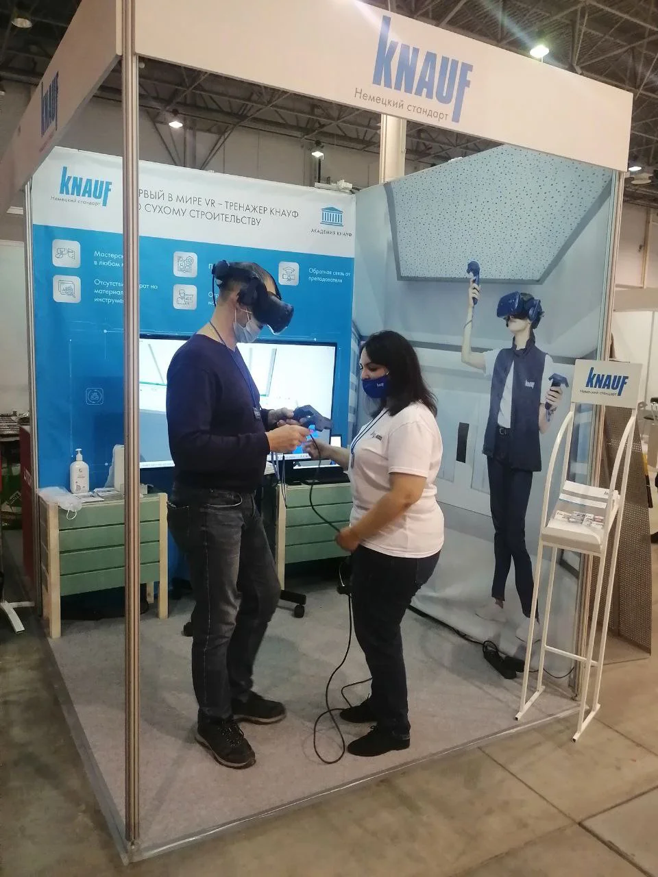 Наибольший интерес у широкой публики вызвал VR-тренажер КНАУФ по сухому строительству, благодаря которому любой посетитель мог, надев шлем и взяв в руки специальные джойстики, научиться собирать перегородку в виртуальной реальности.