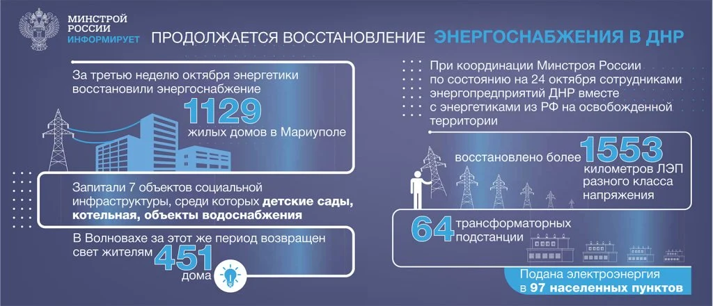 По состоянию на 24 октября сотрудниками энергетических предприятий ДНР вместе с российскими энергетиками на освобожденной территории было восстановлено более 1553 км ЛЭП разного класса напряжения, 64 трансформаторных подстанции, подана электроэнергия в 97 населенных пунктов.
