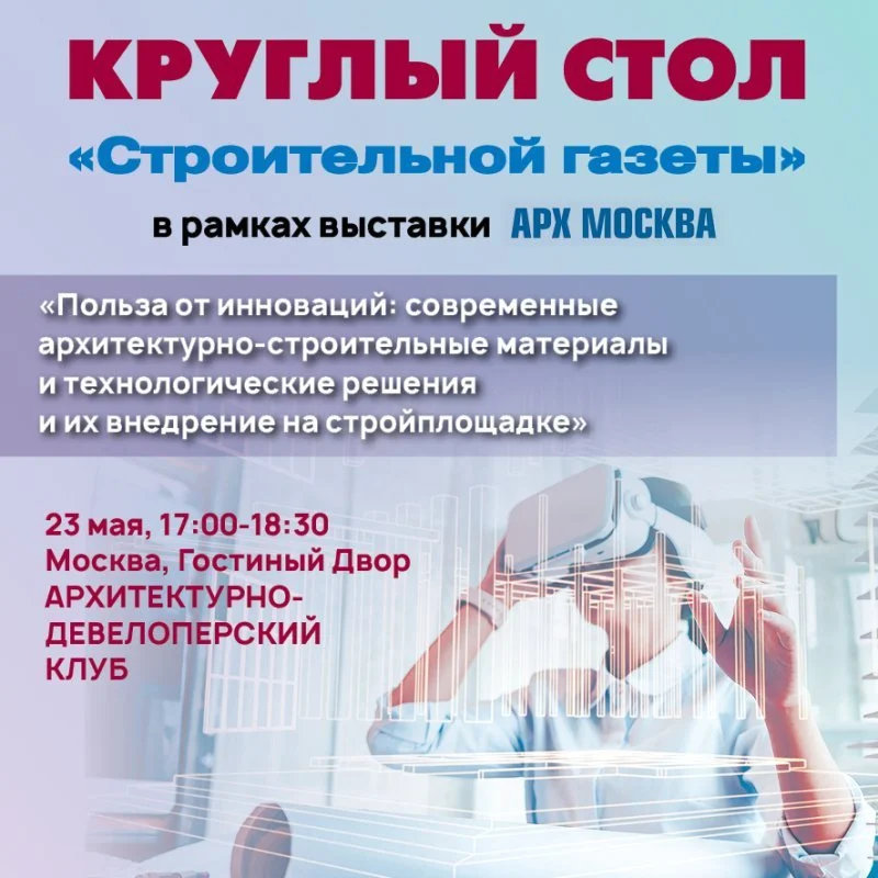 23 мая 2024 года в рамках крупнейшей выставки-форума архитектуры и дизайна АРХ Москва ведущее отраслевое издание «Строительная газета» проведет круглый стол по теме: «Польза от инноваций»: современные архитектурно строительные материалы и технологические решения, и их внедрение на стройплощадке». Мероприятие пройдет на площадке архитектурно-девелоперского клуба в 17.00-18.30.