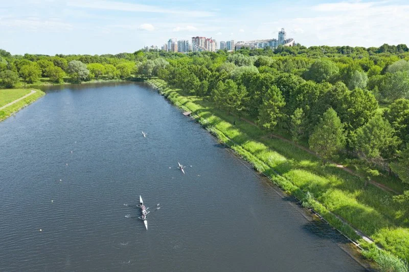 В жилом проекте, который реализуется на участке 65 гектаров в Тушинской пойме, около половины территории отведено под благоустройство и озеленение, включая Центральный и Прибрежный парки, где создается система общественных зон, направленных на эмоциональное и физическое восстановление.