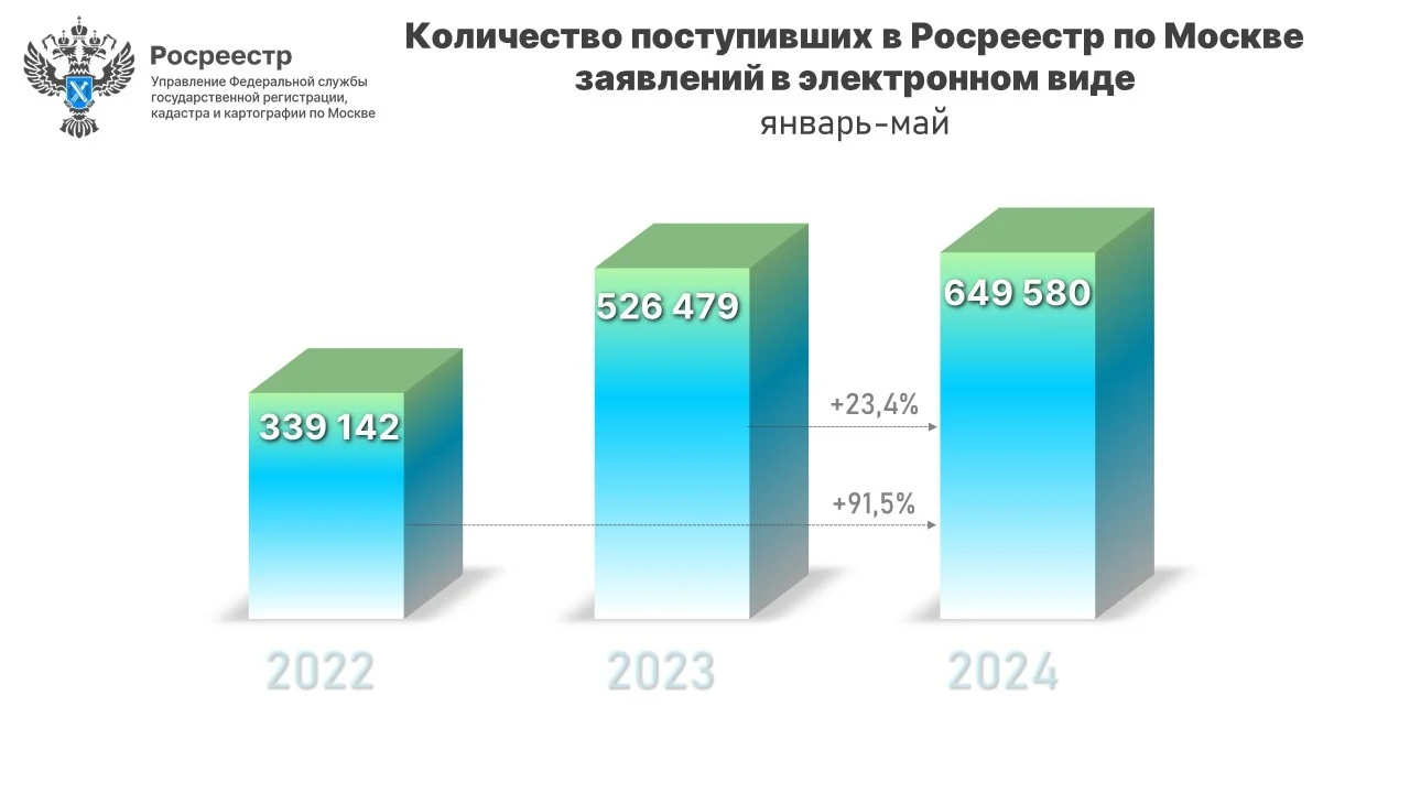 С января по май 2024 года управлением Росреестра по Москве принято 649 580 электронных заявлений на регистрацию прав и постановку на кадастровый учет объектов недвижимости. Данный показатель увеличился почти на четверть (+23,4%) к 5 месяцам 2023 года (526 479), а к аналогичному периоду 2022 года (339 142) отмечен практически двукратный рост (+91,5%). Об этом сообщил руководитель управления Росреестра по Москве Игорь Майданов.