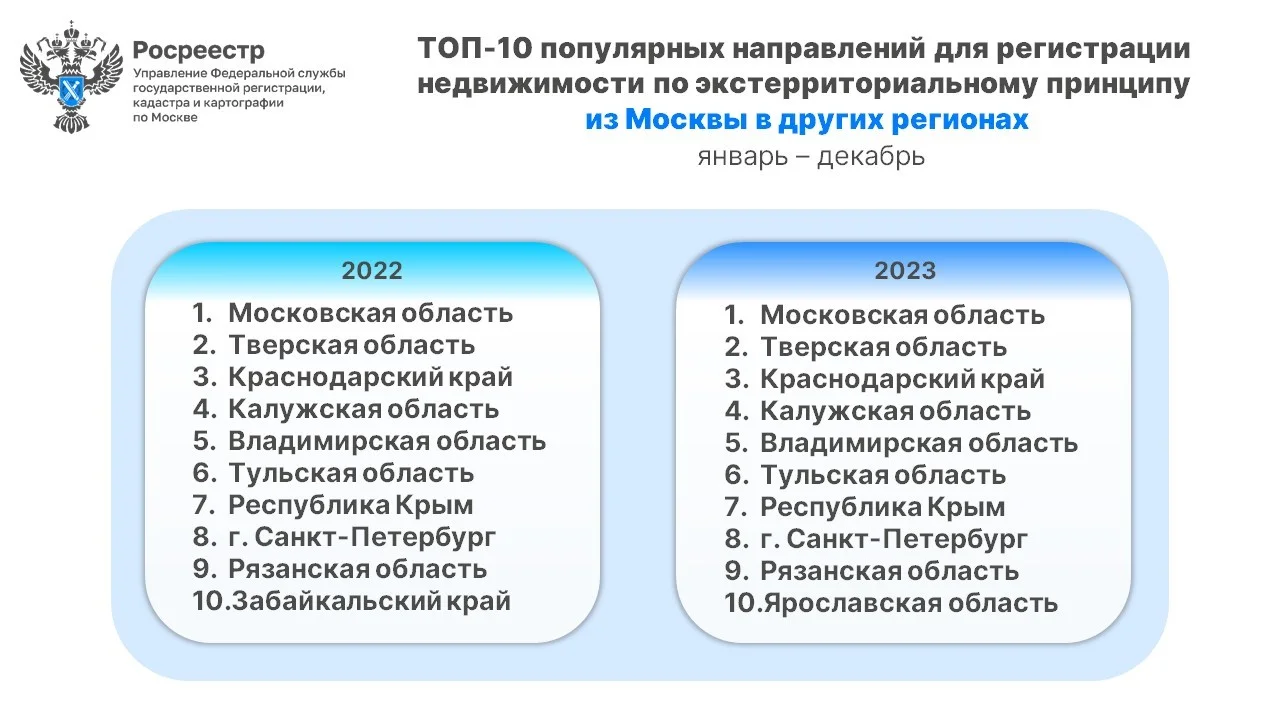 «За год число экстерриториальных обращений увеличилось более чем в полтора раза за счет возможности подачи документов через многофункциональные центры по всей стране. При этом предпочтения жителей столицы в отношении других регионов на протяжении двух лет остаются неизменными, за исключением десятой позиции, где Забайкальский край уступил место Ярославской области. Если смотреть в процентном соотношении, то на долю Подмосковья, с учетом возросшего интереса к ИЖС, в прошлом году пришлось 77,5% заявлений, в Тверской области и Краснодарском крае по 4% и 3,5% соответственно», — пояснил Игорь Майданов.