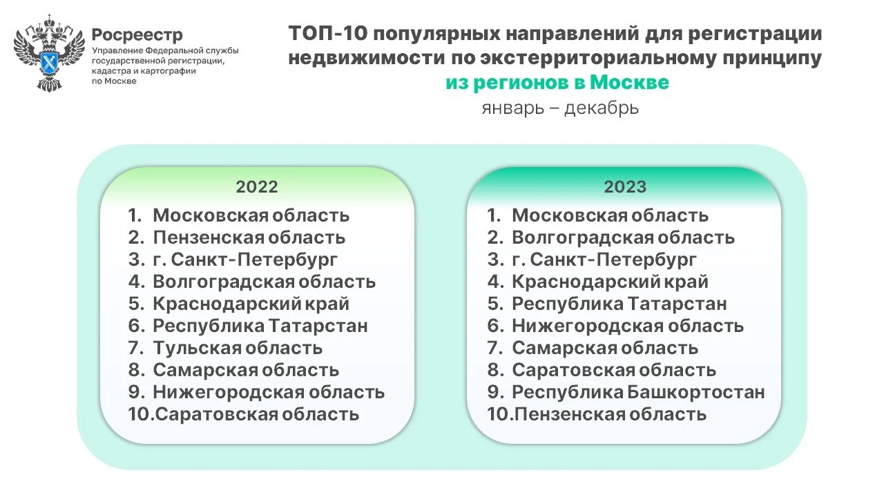 «В отношении московской недвижимости интерес со стороны других регионов сохраняется стабильно в первой десятке с разным распределением долей. Единственное из ТОП-10 выбыла Тульская область и впервые мы фиксируем заявления из Башкортостана. На первую тройку: Московская и Волгоградская области, Санкт-Петербург приходится 69% от всех обращений», — отметил руководитель управления Росреестра по Москве Игорь Майданов.