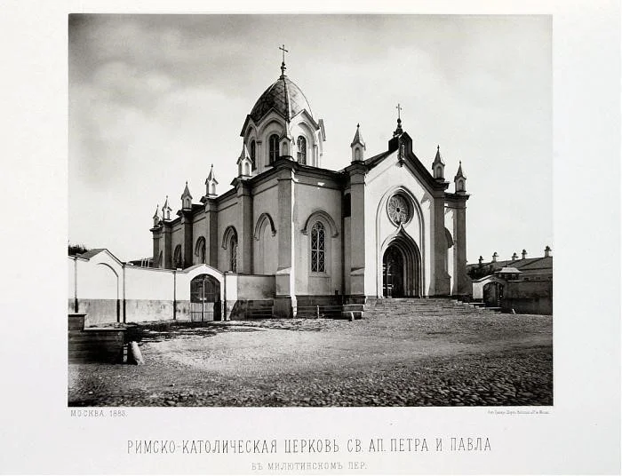 Есть на рынке особняков Москвы и здания с долгой и непростой судьбой. За фасадом особняка в Милютинском переулке 18А в стиле сталинского ампира, украшенного барельефами и фальш-колоннами скрывается история костёла святых Петра и Павла, построенного в 1839-1845 гг. по проекту Алессандро Жилярди на пожертвования московских католиков. От здания церкви, построенной в стиле позднего московского классицизма, сохранился портик (выступающая фасадная часть, украшенная двумя белыми колоннами). В 1920-е гг. костел был перестроен в кинозал, а после попадания немецкой бомбы в период ВОВ – в здание научно-исследовательского института в 1946 году.