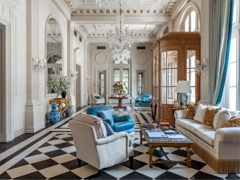 В отделке фасадов и интерьеров преобладают натуральные материалы: крупноформатный камень (гранит, мрамор, известняк), ценные породы дерева, элементы ручной работы, которые десятилетиями сохраняют свою выразительность и актуальность. В декоре востребованы металлы — латунь и медь. Панорамное остекление перестало быть просто опцией и стало полноценным архитектурным языком: моллированные окна с плавными радиусами, безрамное остекление террас, стирающее границу между интерьером и внешним миром. Инженерия — невидима, но делает комфорт измеримым: многоступенчатая очистка воздуха и воды, зонированный климат, цифровой двойник здания, предиктивное обслуживание, единое приложение резидента — все это обеспечивает режим тишины и управляемую эксплуатацию.