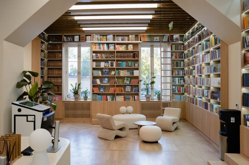 «Особенностью обновленной библиотеки стали открытость и гибкость сценариев ее использования. На смену изолированным книжным залам пришли светлые, проницаемые, связанные друг с другом пространства. Закрытые хранилища преимущественно сменила свободная выкладка книг на стеллажах. Большой зал с исторической лепниной стал многофункциональным: теперь здесь можно читать лекции, проводить кинопоказы и мастер-классы. На первом этаже библиотеки расположились рабочие зоны, зал для собраний, тихие коворкинги и музыкальный класс», — рассказывает основательница архитектурного бюро ludi_architects Любовь Леонтьева.