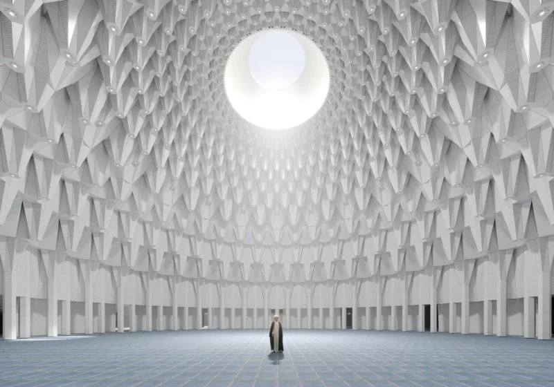Здание представляет собой черный куб, внутри которого в центре находится молельный зал. Традиционная для мечети форма купола отсылает к расположению молящихся вокруг Каабы, а пространство по периметру должен занять музей истории ислама. Таким образом, экспозиция, обрамляя зал, поддерживает связь с центром мечети.