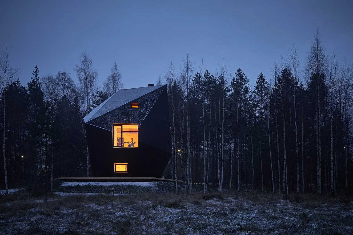 Кристаллическая форма применяется архитекторами не только в возведении монументальных и общественных строений. Иногда такими решениями вдохновляются архитекторы частных домов. Так, в финской провинции построен первый и единственный в мире коттедж, выполненный в форме метеорита. Спроектированный архитектурно-дизайнерской студией Ateljé Sotamaa дом, представляет собой жилое здание площадью 65 квадратных метров. Через потолочное окно площадью 10 квадратных метров в центре здания открывается вид на небо. Лесной домик изготовлен из сборных панелей из поперечно-слоистой древесины (CLT). Внутри посетители могут насладиться потрясающим видом на окружающую дикую местность и узнать об истории и науке о метеоритах.
