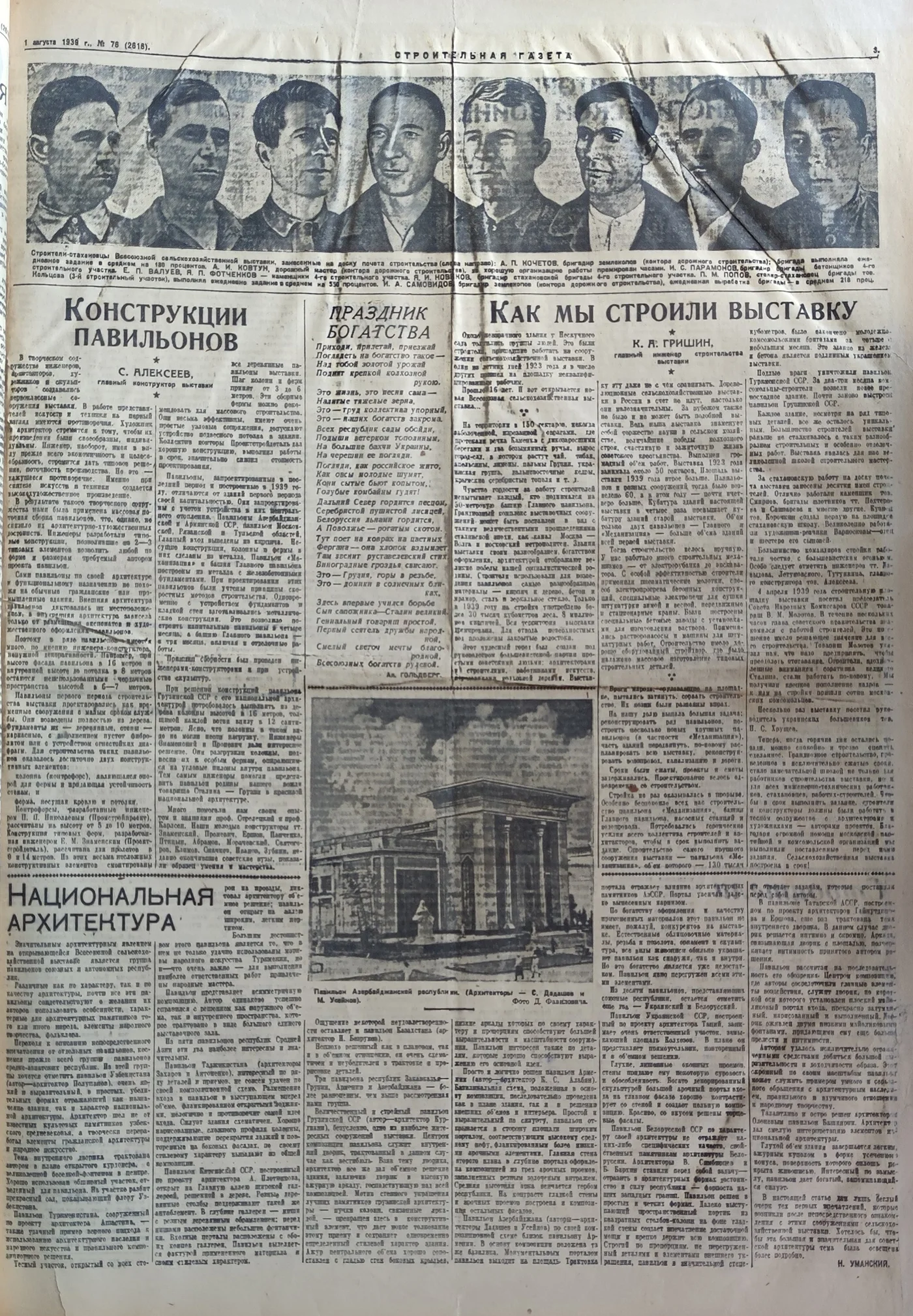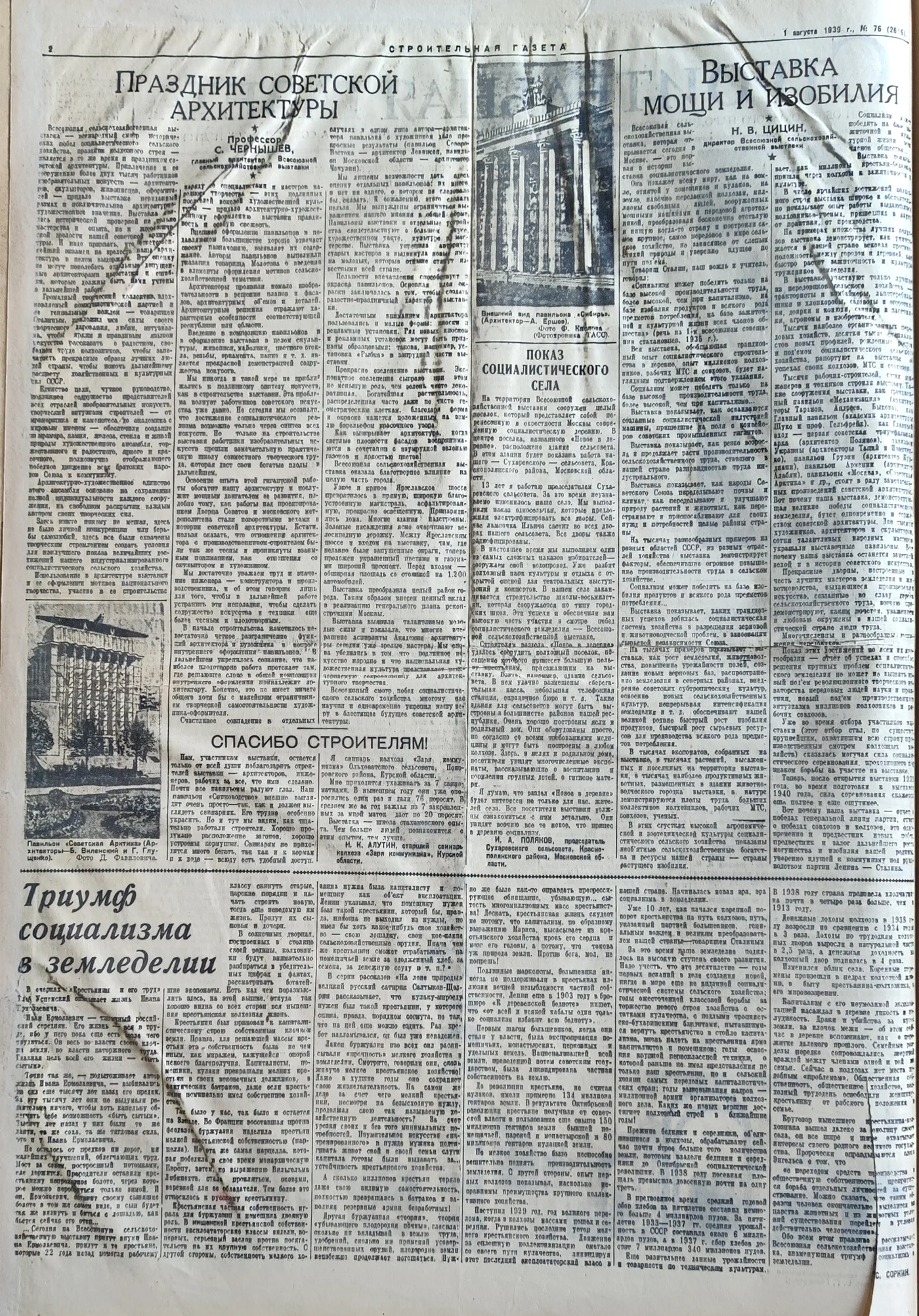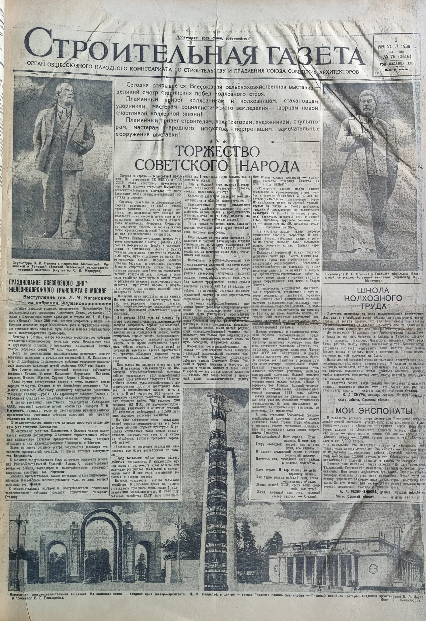 Однако изначально выставка должна была быть построена вовсе не на далекой окраине города и открыться на два года раньше, о чем свидетельствуют архивы, собранные в Центральной научно-технической библиотеке по строительству и архитектуре (ФБУ «ЦНТБ СиА» (cntb-sa.ru) при ФБУ «РосСтройКонтроль»). На базе найденных там публикаций «Архитектурной газеты» за 1935 год «Стройгазета» провела свое расследование для рубрики «ГОРОДская история».