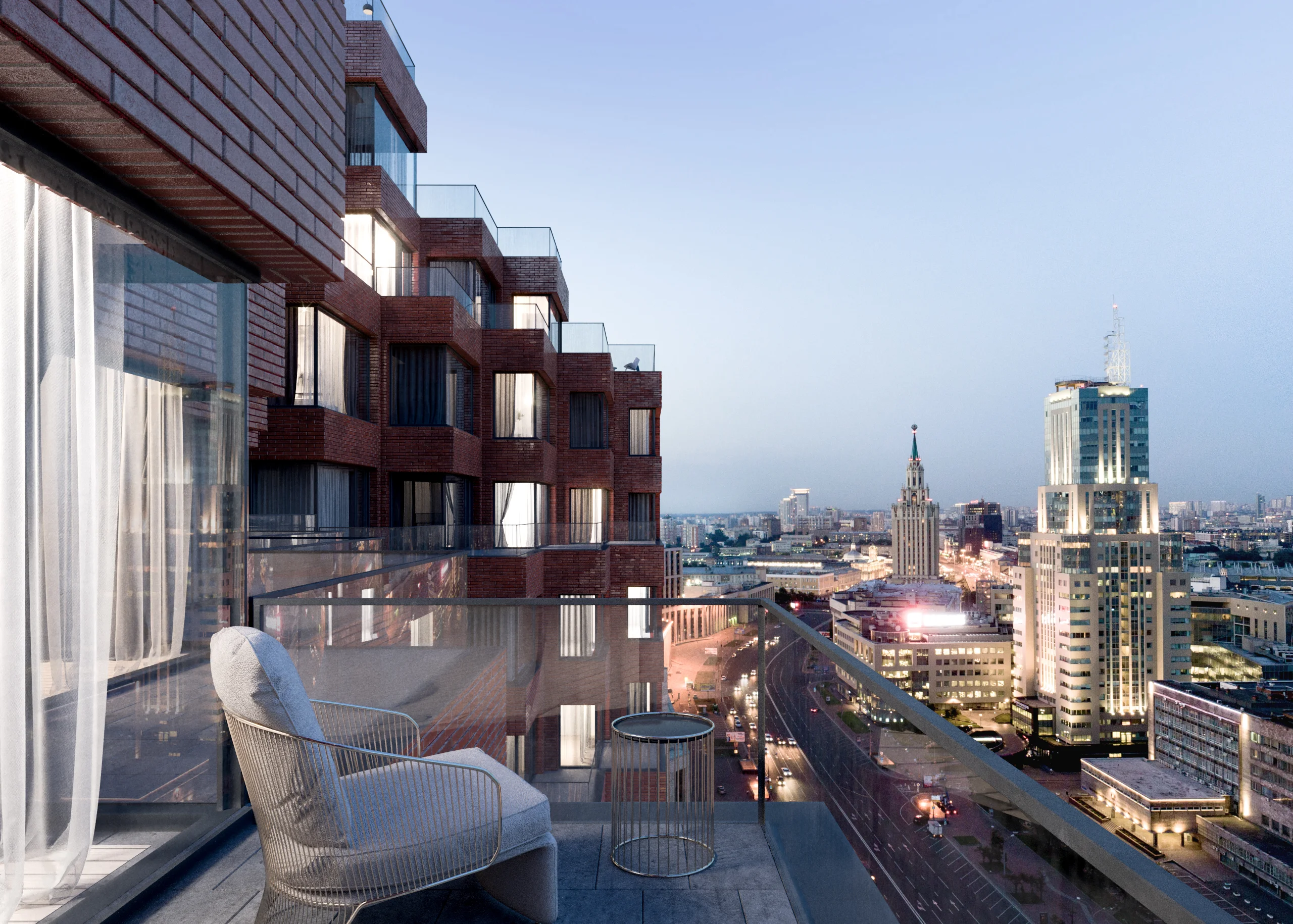 Объемное решение жилого комплекса предполагает большое количество угловых и панорамных окон, в том числе — за счет консольного нависания. Благодаря такому решению с верхних этажей жилого комплекса обеспечиваются панорамные виды по всем направлениям.