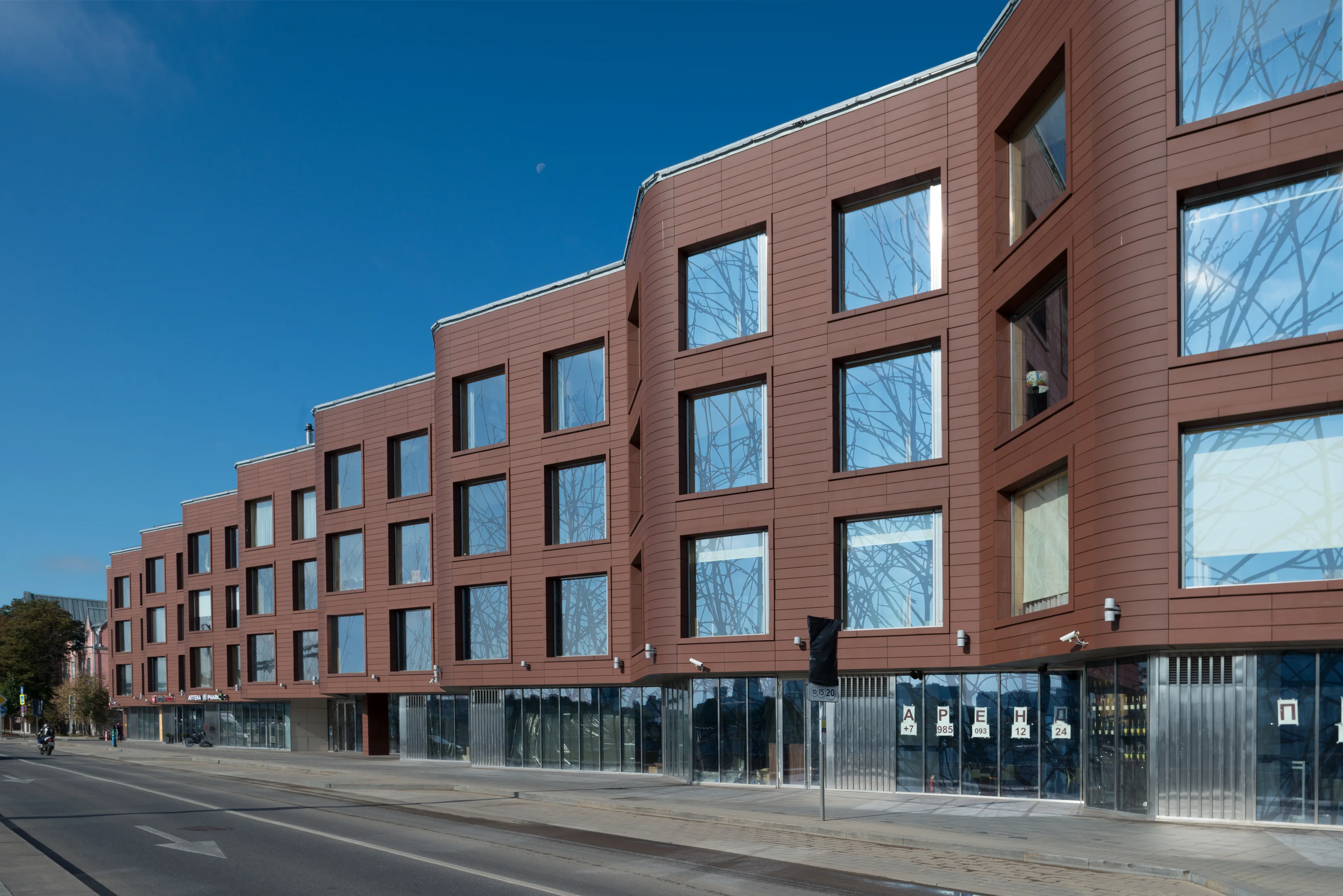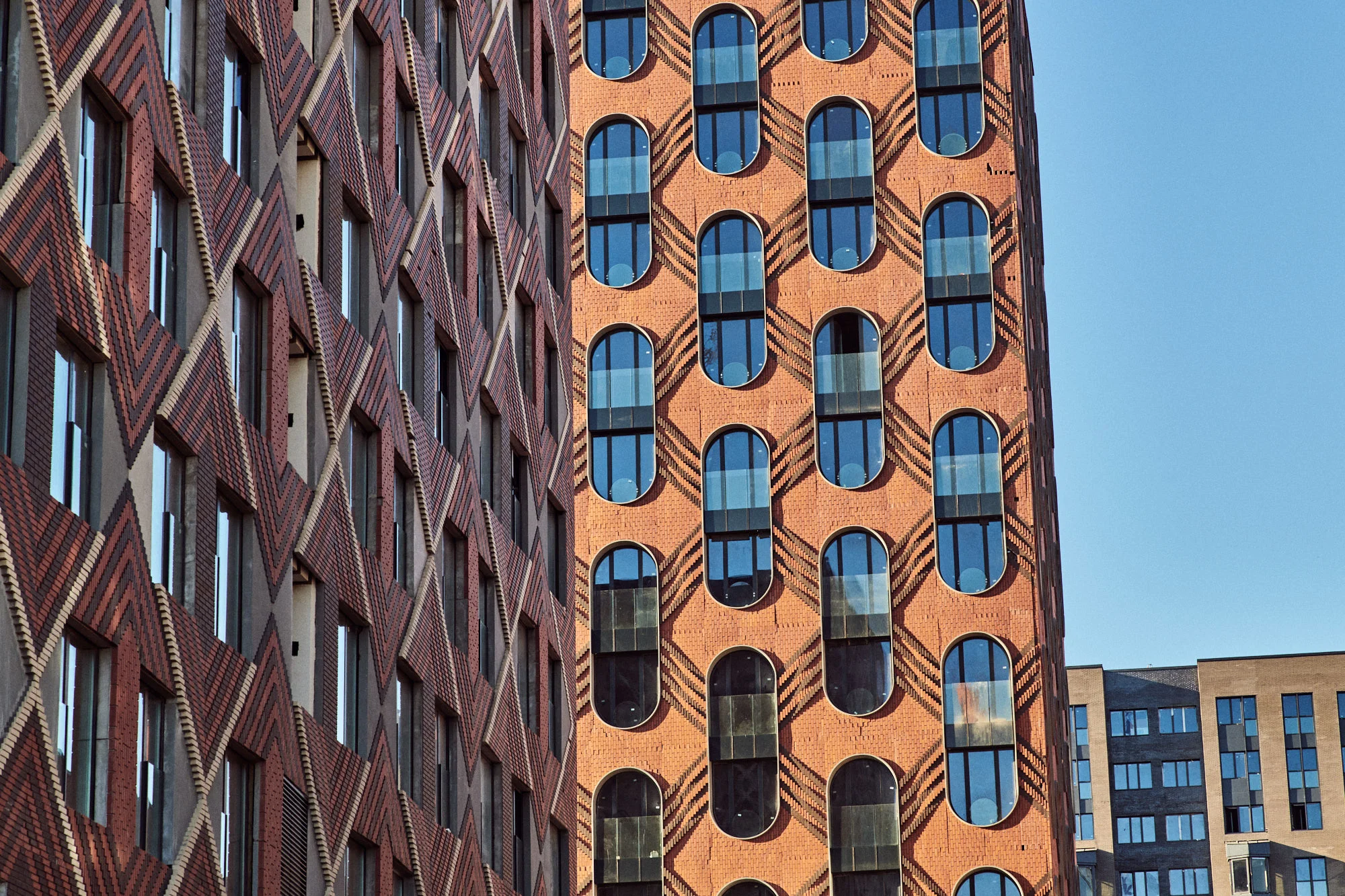 Отделка фасадов как бы подчеркивает «голландский акцент» домов. Округлые и угловые формы фасада формируют особую пластичность, а повторяющиеся элементы задают ритм. Эркеры или окна по двум сторонам квартиры — одно из характерных отличий голландской архитектуры.
