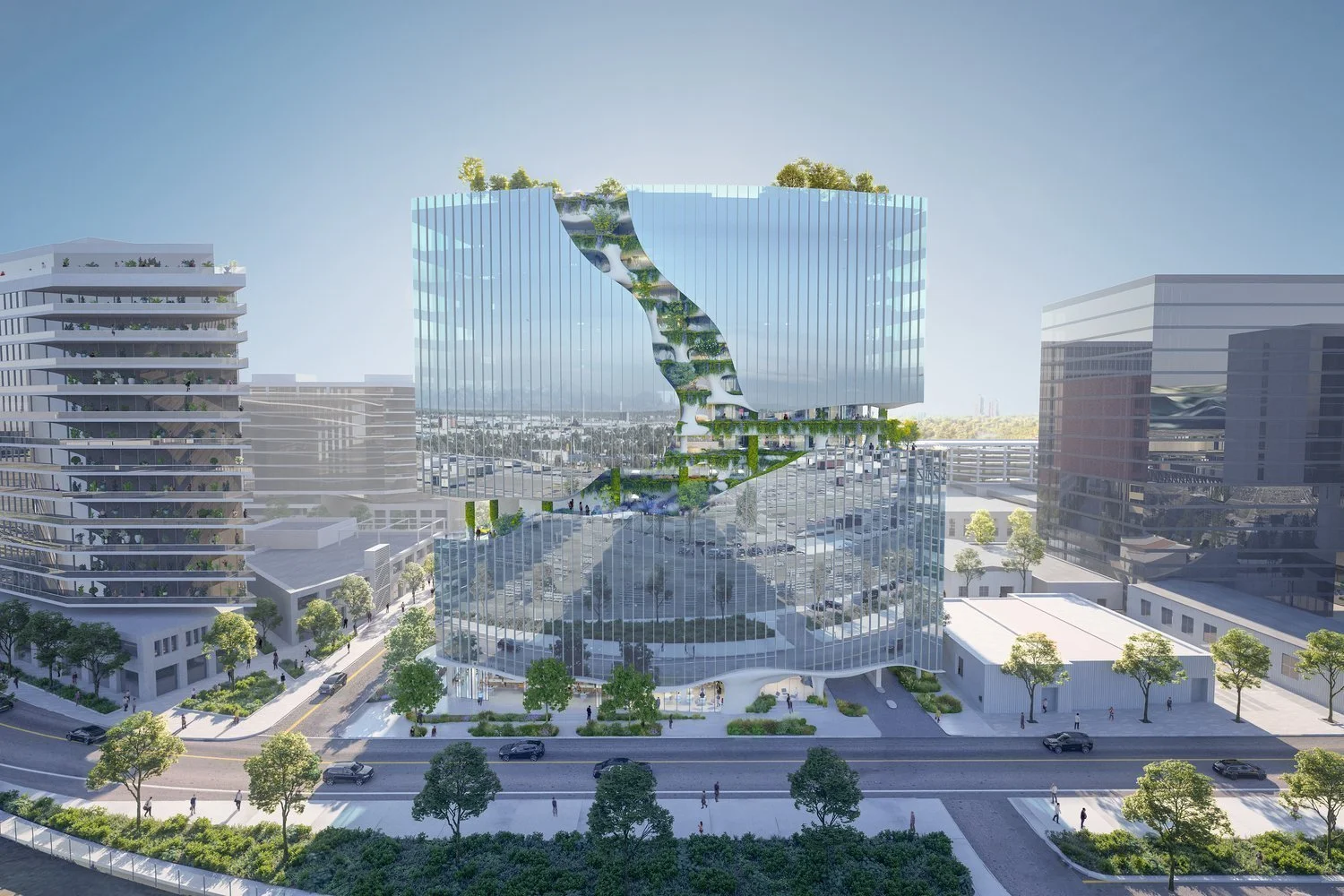 В американском Денвере (штат Колорадо) началось строительство жилой 16-этажной башни One River North. Башня, спроектированная международным бюро MAD Architects, привлекает внимание гигантской трещиной на фасаде, протянувшейся на десять этажей и открывающей «природный, внутренний мир» здания. В MAD Architects описывают эту особенность как «вертикальный ландшафтный раскол», заполненный 1200 квадратными метрами зеленых пространств. По части этого «разлома» пройдет «экологическая тропа», которая поднимается на четыре этажа вверх. Вокруг будут высажены растения и появятся искусственные водоемы. Тропа будет открыта для жителей и посетителей One River North.