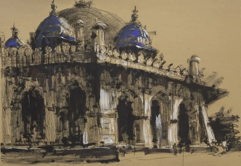 Используя минимальное количество материалов — уголь, белила и немного цветовых акцентов, Сергей Кузнецов добивается поразительной пространственной глубины в работах, выстраивая объемы исключительно за счет световых акцентов. Архитектурную графику принято считать академическим процессом, не сочетающимся с современным искусством. Размер работ используется как инструмент, позволяющий выстроить диалог с уже известными зданиями. Крупный формат произведений, с одной стороны, дает художнику динамичность, порывистость и свободу исполнения. С другой, несмотря на внушительные размеры, работы остаются камерными и передают ощущение легкости и невесомости. Сохраняя черты эскизности за счет резких широких линий и экспрессивной штриховки, тем не менее композиции представляются законченными произведениями.
