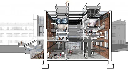 По словам авторов проекта, одной из главных задач было снова соединить здание с рекой. Снова заработает терраса с выходом на набережную Москвы-реки, попасть туда можно будет через фойе. «Сейчас, чтобы выйти к реке, нужно либо пройти по узкому проходу, либо обходить здание. Поэтому мы решили открыть заложенные кирпичом проемы, через которые будет видно Москву-реку, — рассказывает партнер Kleinewelt Architekten Георгий Трофимов. — В том месте, куда упала бомба, растут деревья: мы решили не вырубать их, а, наоборот, разбить посреди помещения сад. Между этажами как спираль проходит пандус, и, двигаясь по нему, можно рассмотреть каждый кусочек стены. Наверху — стеклянная кровля, через которую проникает естественный свет».