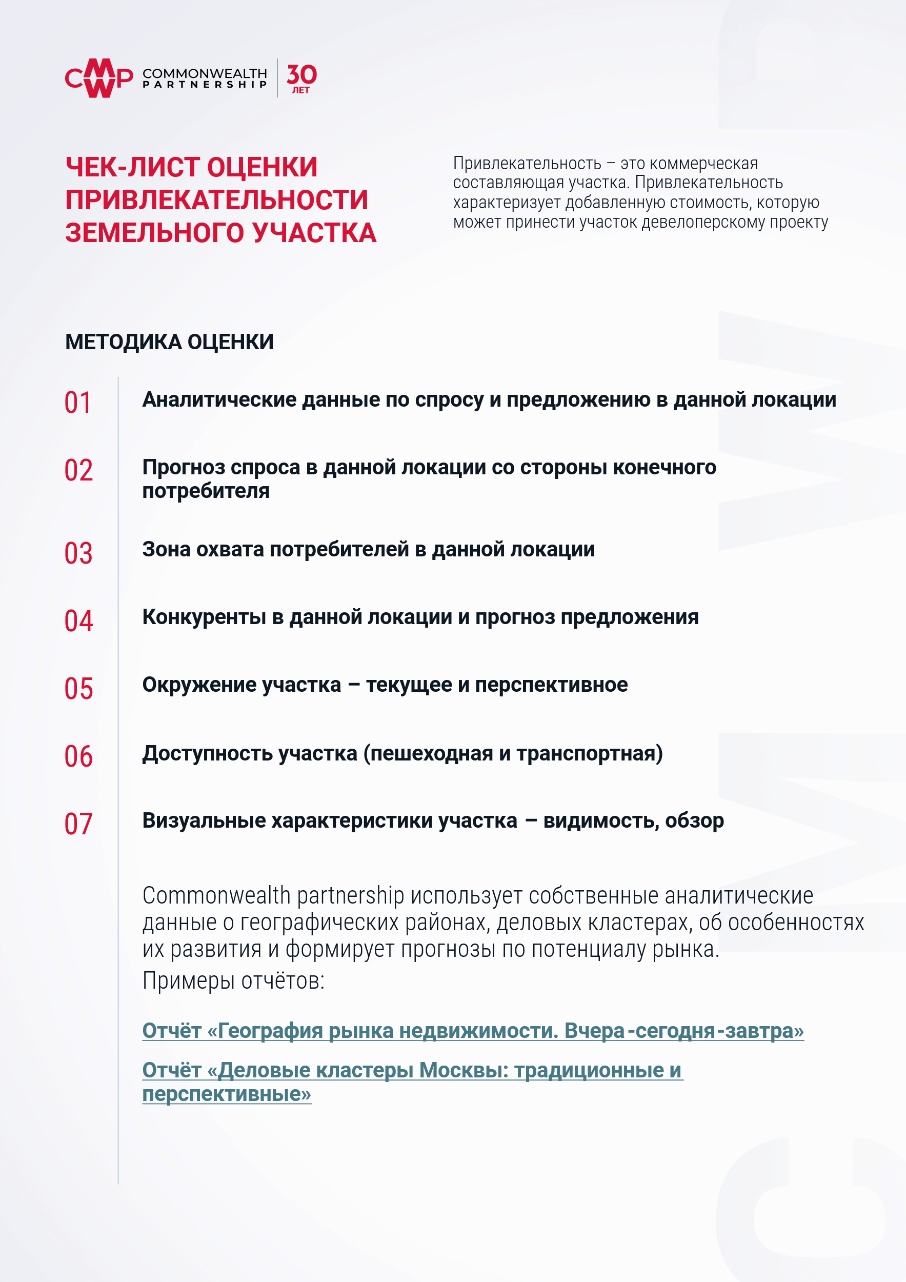 Для оценки компания CMWP использует собственную аналитику — по географическим районам, деловым кластерам, их особенностям развития и прогнозу рыночного потенциала на ближайшую и долгосрочную перспективу. Эксперты анализируют динамику концентрации офисов в Москве, прогнозируют развитие деловых кластеров и их жизненный цикл. Эти данные позволяют оценивать участки по соотношению стоимости и потенциальной коммерческой эффективности.
