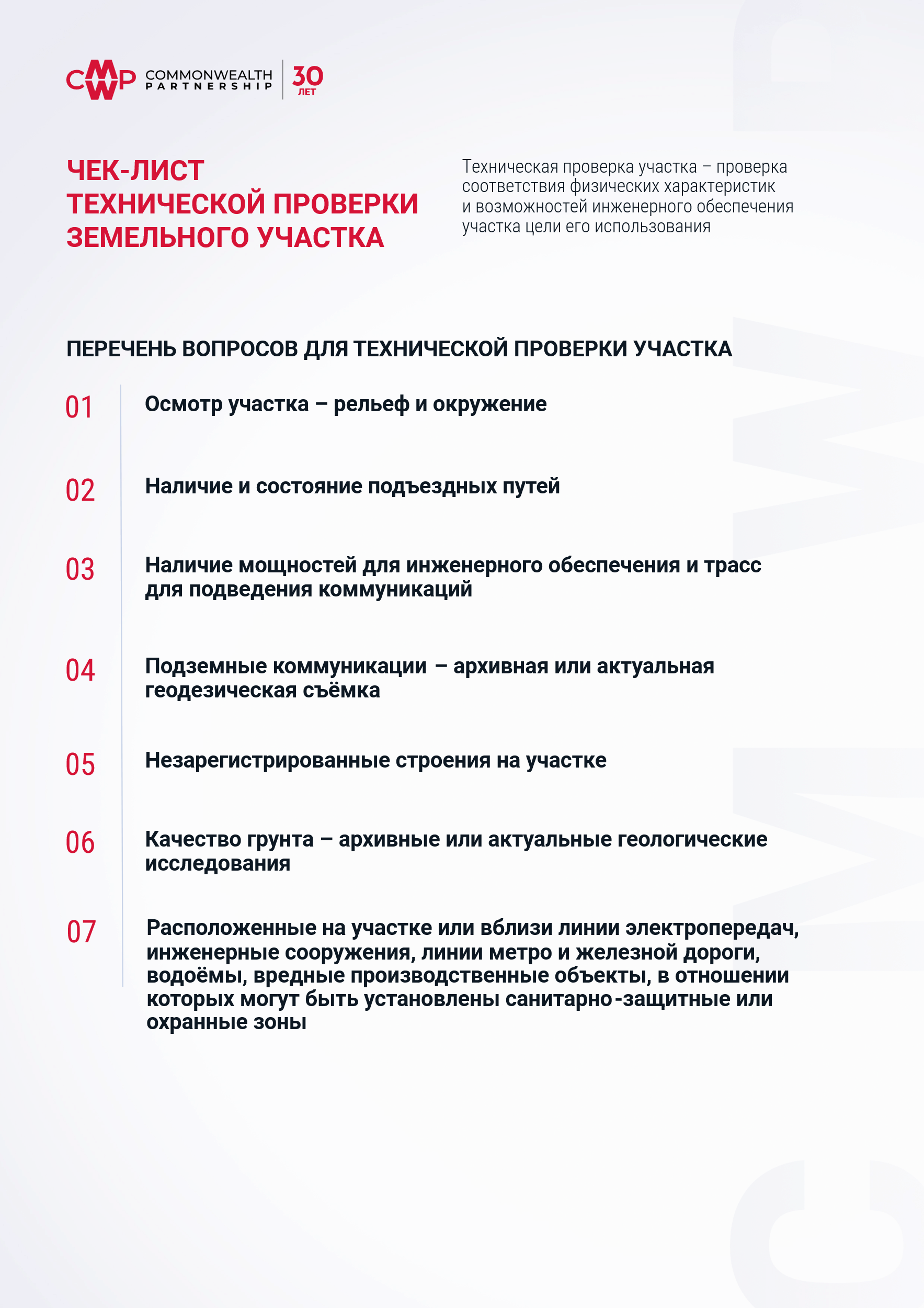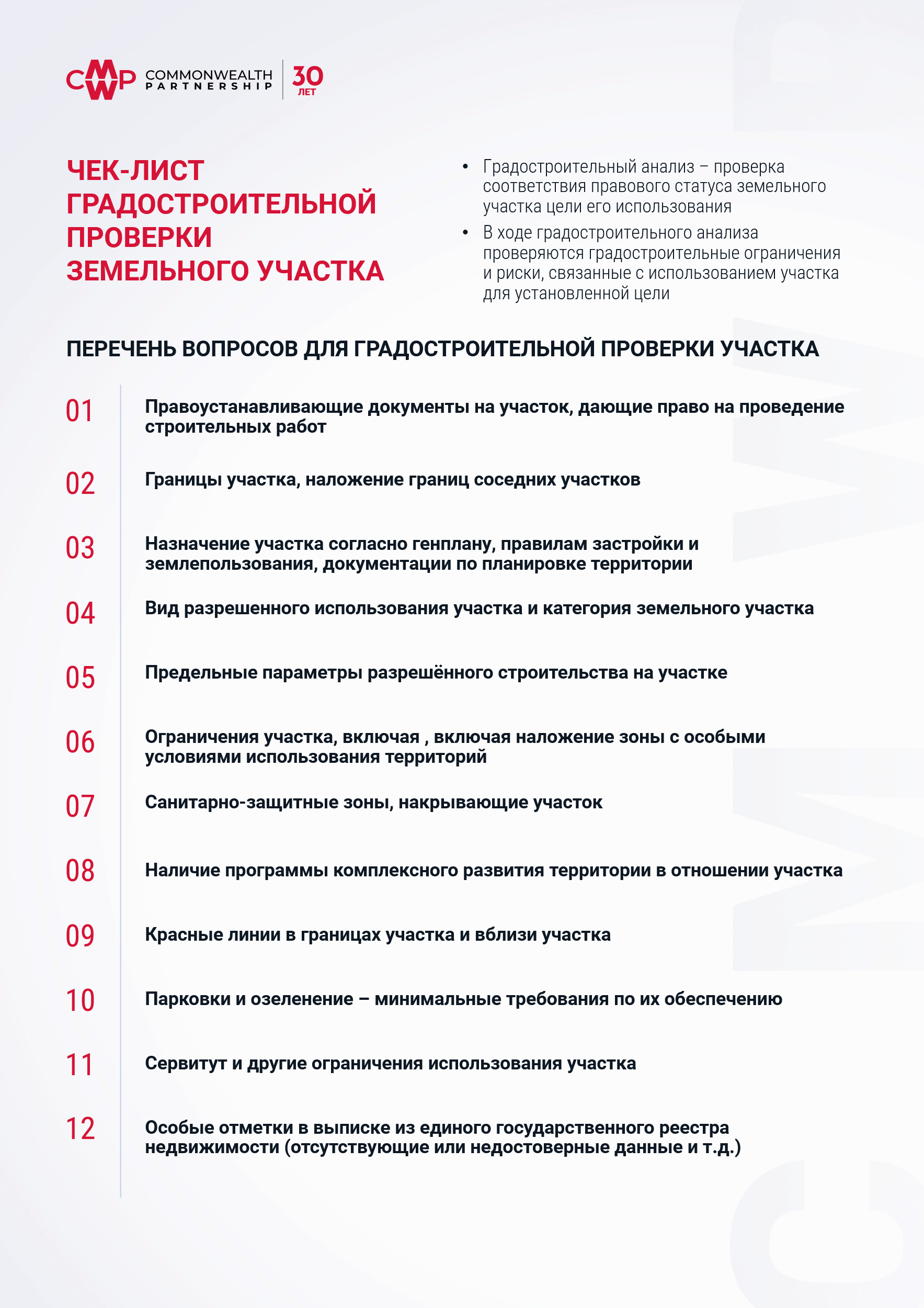 Ниже – наш чек-лист для третьего шага – проверки на градостроительные ограничения. Этот чек-лист может быть использован также для постановки задачи на проверку участка или при чтении представленного отчета о проверке.