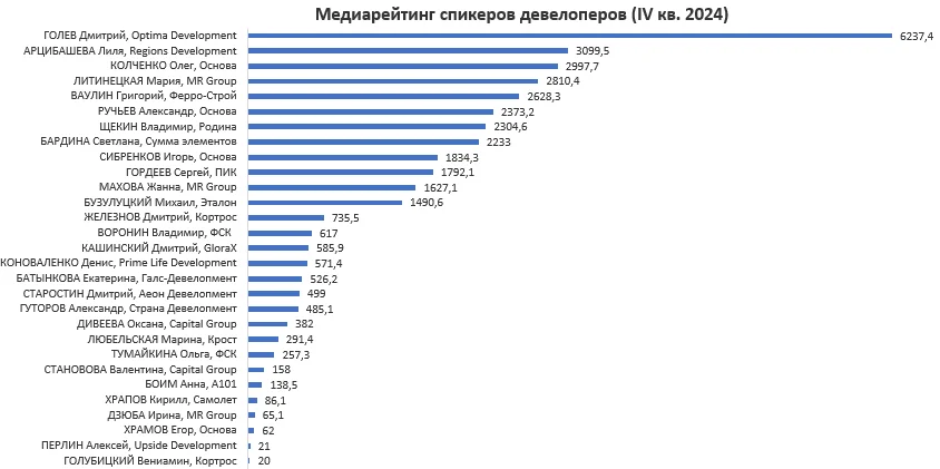 «Строительная газета» совместно с «Медиалогией» (система аналитики социальных медиа и СМИ, лидирующая на рынке по количеству источников) подготовила традиционный ежеквартальный медиарейтинг персон девелоперских компаний за IV квартал 2024 года. Рейтинг составляется по МедиаИндексу, который измеряет прежде всего качество контента. Лидерами стали коммерческий директор Optima Development Дмитрий Голев, коммерческий директор Regions Development Лилия Арцибашева, управляющий партнер ГК «Основа» Олег Колченко.