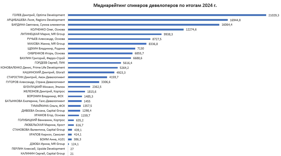 Согласно данным «Строительной газеты» и «Медиалогии», в первую десятку спикеров девелоперских компаний по МедиаИндексу также вошли председатель совета директоров, президент ГК «Основа» Александр Ручьев, совладелец и основатель Группы Родина Владимир Щекин, директор департамента продаж жилой недвижимости ГК «Сумма элементов» Светлана Бардина, коммерческий директор ГК «Основа» Игорь Сибренков, основной акционер компании «ПИК» Сергей Гордеев.