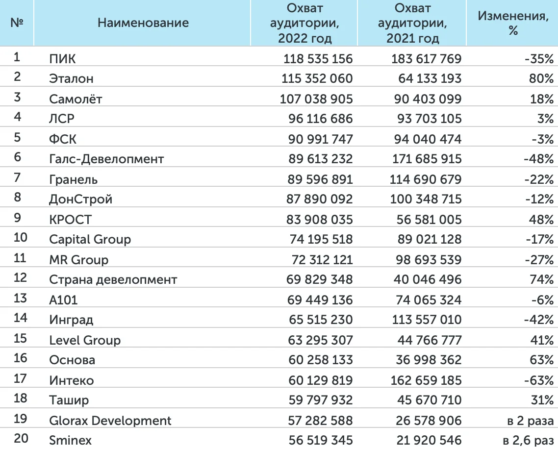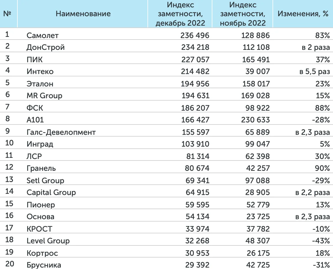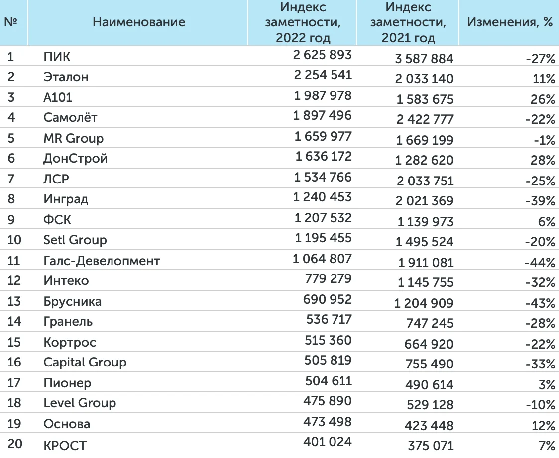 Абсолютным лидером медиарейтингов 2022 года стала ГК «ПИК». На втором месте по Индексу заметности и охвату аудитории – ГК «Эталон». На третьем месте по количеству упоминаний и «заметности» компании СМИ в 2022 году находится ГК «А101». «Группа ЛСР» в ушедшем году заняла второе место по количеству упоминаний. ГК «Самолет» расположилась на третьей строчке рейтинга, оценивающем охват аудитории.