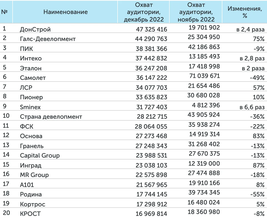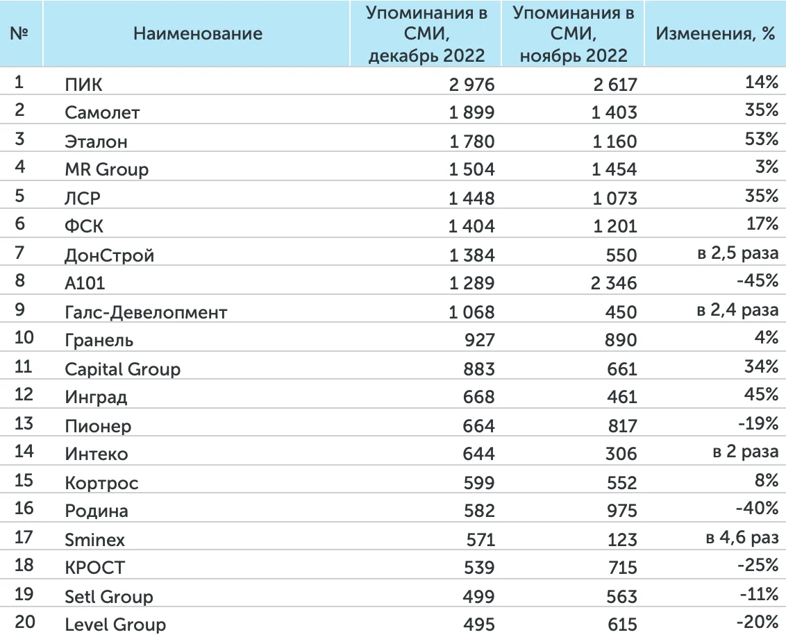 В медиарейтингах девелоперов в декабре 2022 года сохранили свое присутствие на высших строчках рейтинга ГК «ПИК» и ГК «Самолет». Кроме того, в топ-3 вошли девелоперы «Донстрой», Галс-девелопмент и ГК «Эталон».